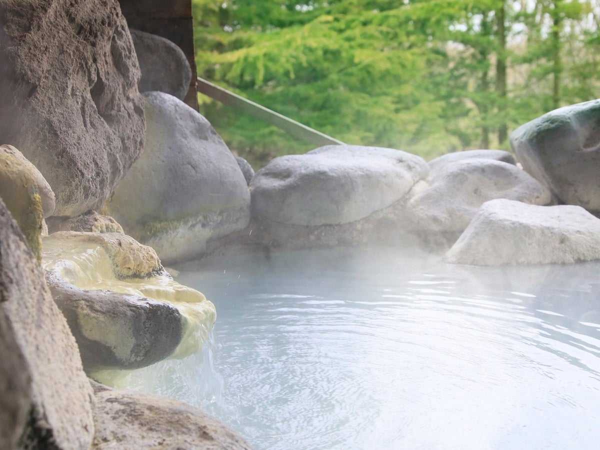 露天風呂は湯治にも用いられる鹿の湯を源泉としています。白く濁り少しとろみのある酸性含硫黄泉は様々な健康増進効果が期待できる他、入浴後のお肌はしっとりと滑らかで美肌効果も期待できます。
