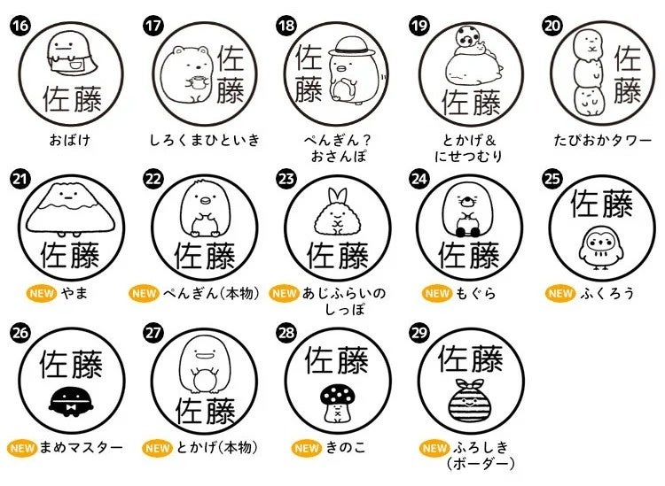 やま、ぺんぎん(本物)、あじふらいのしっぽ、もぐら、まめマスターなどがあらたに登場し合計29種類に。かわいいすみっコたちが自分のもちものを教えてくれる、布プラOKのとっても便利なスタンプです。
