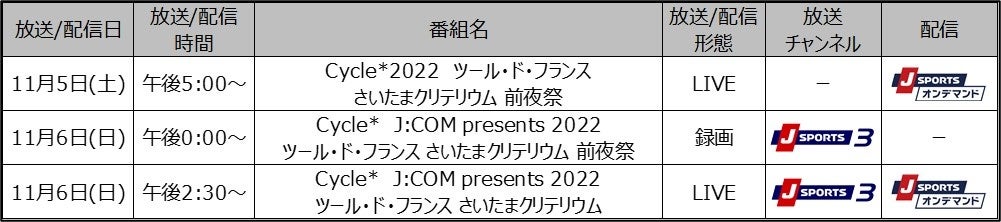 さらにレース前日の11月5日(土)には、J SPORTSによるイベント「2022ツール・ド・フランスさいたまクリテリウム 前夜祭スペシャル」(詳細別紙)を3年ぶりに開催します。