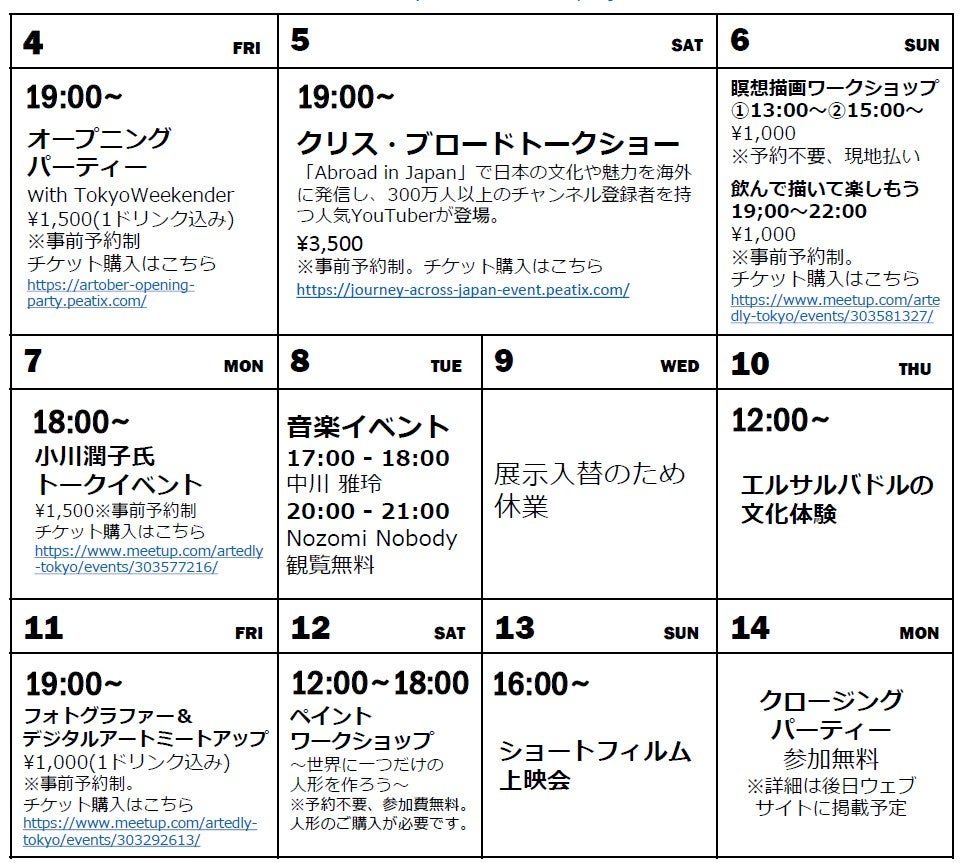 ◇大人気YouTuberのトークショーや、ライブペインティング、音楽ライブ、文化体験など、毎日さまざまなイベントを開催。 詳細はこちら→https://artober.tokyo/ja/event-schedule#4th