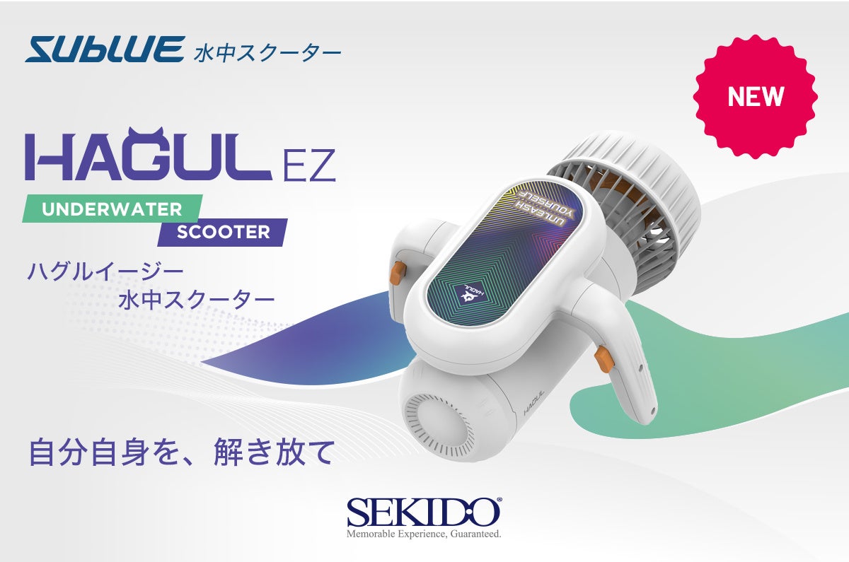 世界中のダイビングユーザーに人気の水中スクーター「SUBLUE(サブルー)」の日本総代理店、株式会社セキド(本社:東京都港区、代表取締役:⼤下貴之)では、2022年9月16日(金)にエントリーユーザー向け水中スクーターの最新モデル「SUBLUE HAGUL EZ(ハグル イージー)」を世界に先駆けて発売いたします。最大50分間使用できるバッテリーを内蔵し、グリップのボタンを握るだけで誰でも手軽に自由に泳ぐことができる、はじめての水中スクーターにおすすめです。完全一体型のシンプルなデザインの採用により約40%のコストダウンを実現した価格は 44,000円(税込)と、これまでの SUBLUE製水中スクーターでもっともお求めやすくなりました。HAGUL EZ で日常を忘れて、もっと手軽に簡単に水中での自由を楽しんでみませんか?