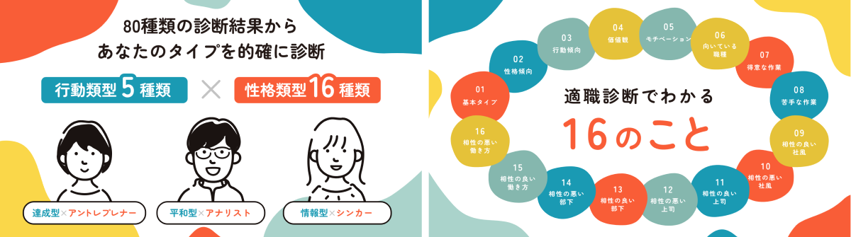 “適職を導き出す事”に最大限特化した独自のキャリアパーソナリティ診断によって、仕事をする上でのあなたの重要なポイントが分かります。「どんな職種が向いているか」「どんな上司と相性がいいか」「どんな部下と相性がいいか」「どんな働き方が向いているか」などを知ることができます。