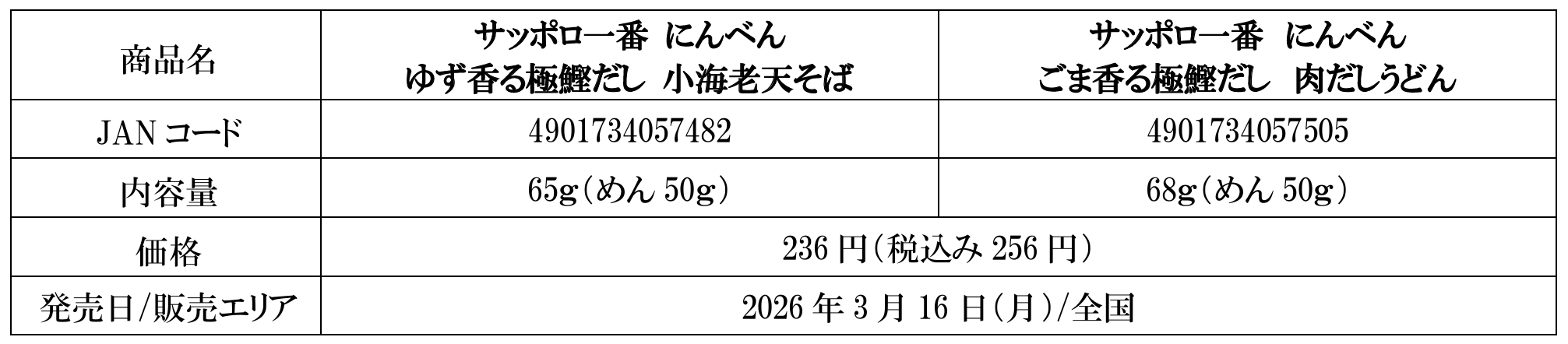 株式会社にんべん(本社:東京都中央区、代表取締役社長:髙津伊兵衛、以下「にんべん」)は、サンヨー食品株式会社(本社:東京、社長:井田純一郎、以下「サンヨー食品」)とのコラボレーション商品「サッポロ一番 にんべん ゆず香る極鰹だし 小海老天そば」「サッポロ一番 にんべん ごま香る極鰹だし 肉だしうどん」が、2026年3月16日(月)より発売されることをお知らせいたします。にんべんの「鰹節粉末」をベースに使用した、爽やかな“ゆず”と香ばしい“ごま”の風味をきかせた、春先にぴったりの季節感あるそばとうどんの和風カップ麺です。
