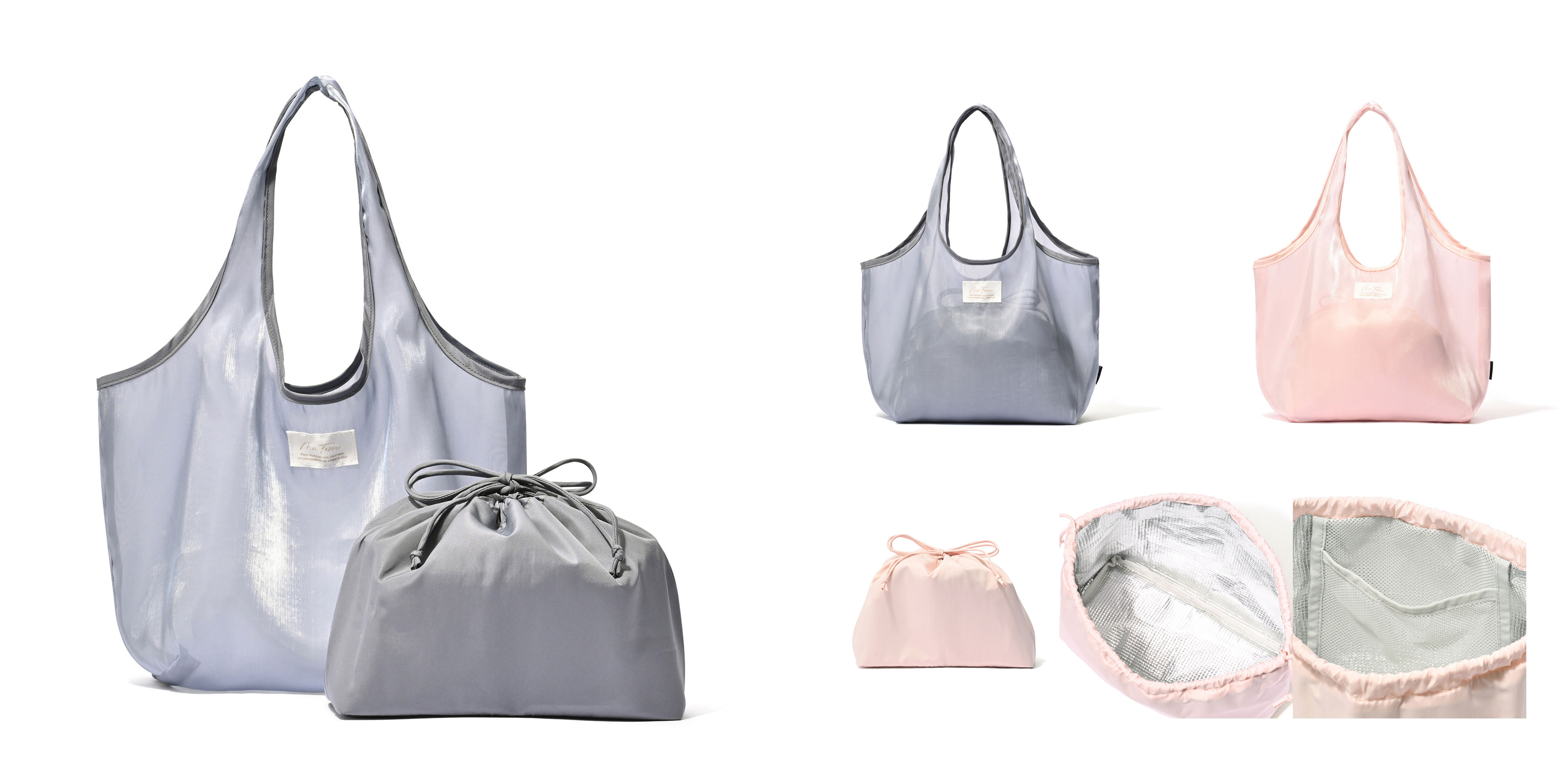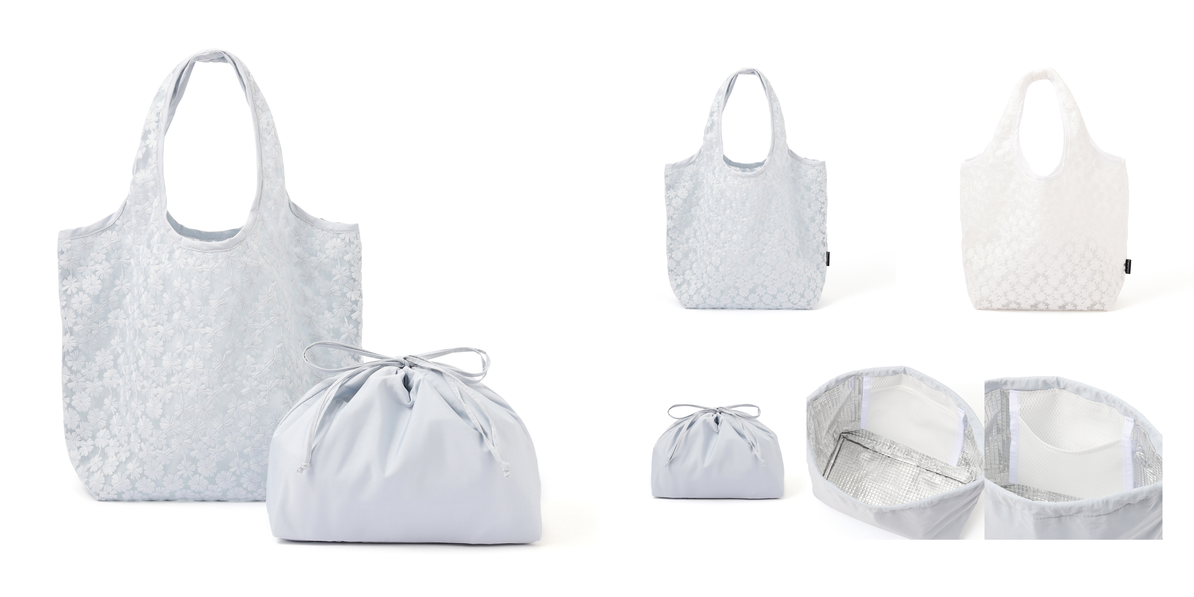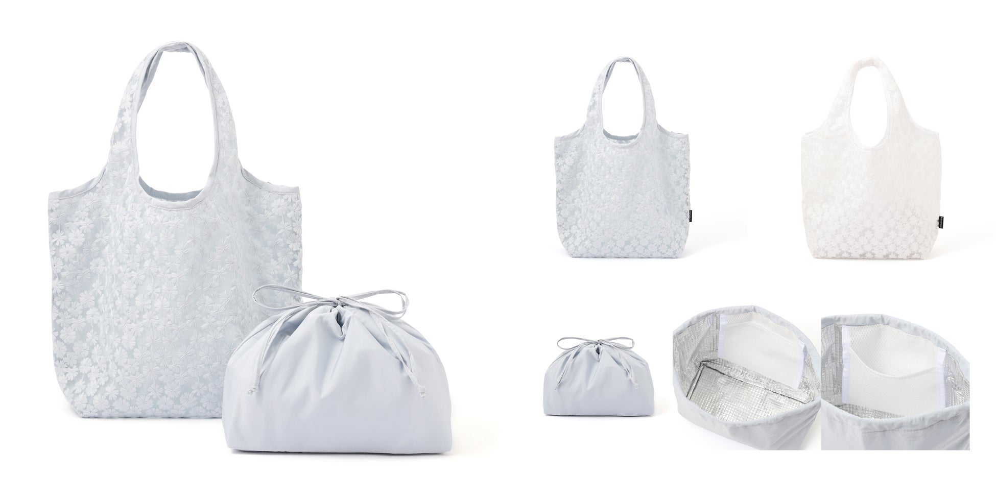 オーガンジーやレースを使用した春らしい軽やかなバッグと、保冷・保温機能を備えたアルミ巾着がセットになったランチバッグです。