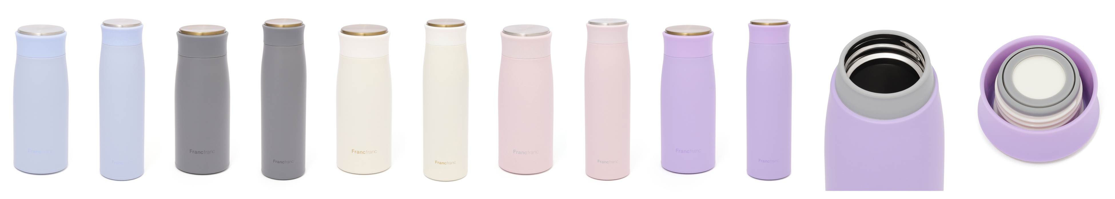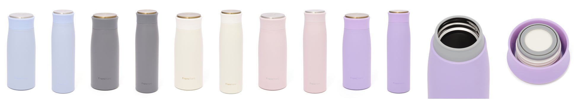 定番人気のステンレスボトルが、トレンドに合わせた明るいカラーリングにリニューアルしました。マットな質感にメタリックのアクセントが映える、エレガントなデザインの軽量ステンレスボトルです。350mlは約180g、500mlは約225gと軽量で持ち運びやすく、真空二重構造で保温・保冷効果にも優れています。優しい口当たりのカバー付き飲み口、デスクに置いたときも静かなシリコン製フットパッドなど、細部まで使いやすさにこだわっています。デザインを合わせたお弁当箱やカトラリーとのコーディネートを楽しめます。