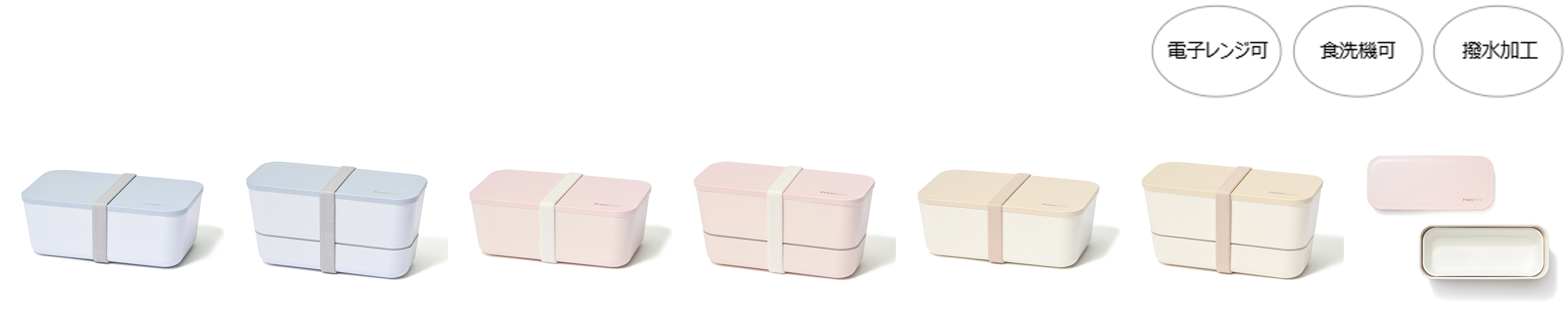 定番人気のランチボックスが、トレンドに合わせた明るいカラーリング&より使いやすい機能にリニューアルしました。食洗機可・電子レンジ可・抗菌効果などの人気の機能はそのままに、内側に撥水加工を施し油汚れが落ちやすい仕様に改良。また、お客様の声を受け、バンド素材をシリコンから布製に変更し、より開けやすく、使い心地も向上しました。これまで同様、2段タイプは女性にちょうどいい容量がありながら、バッグやリュックに収めやすいスリムなフォルムなので持ち運びにも便利なサイズ感。重ねてコンパクトに収納可能です。