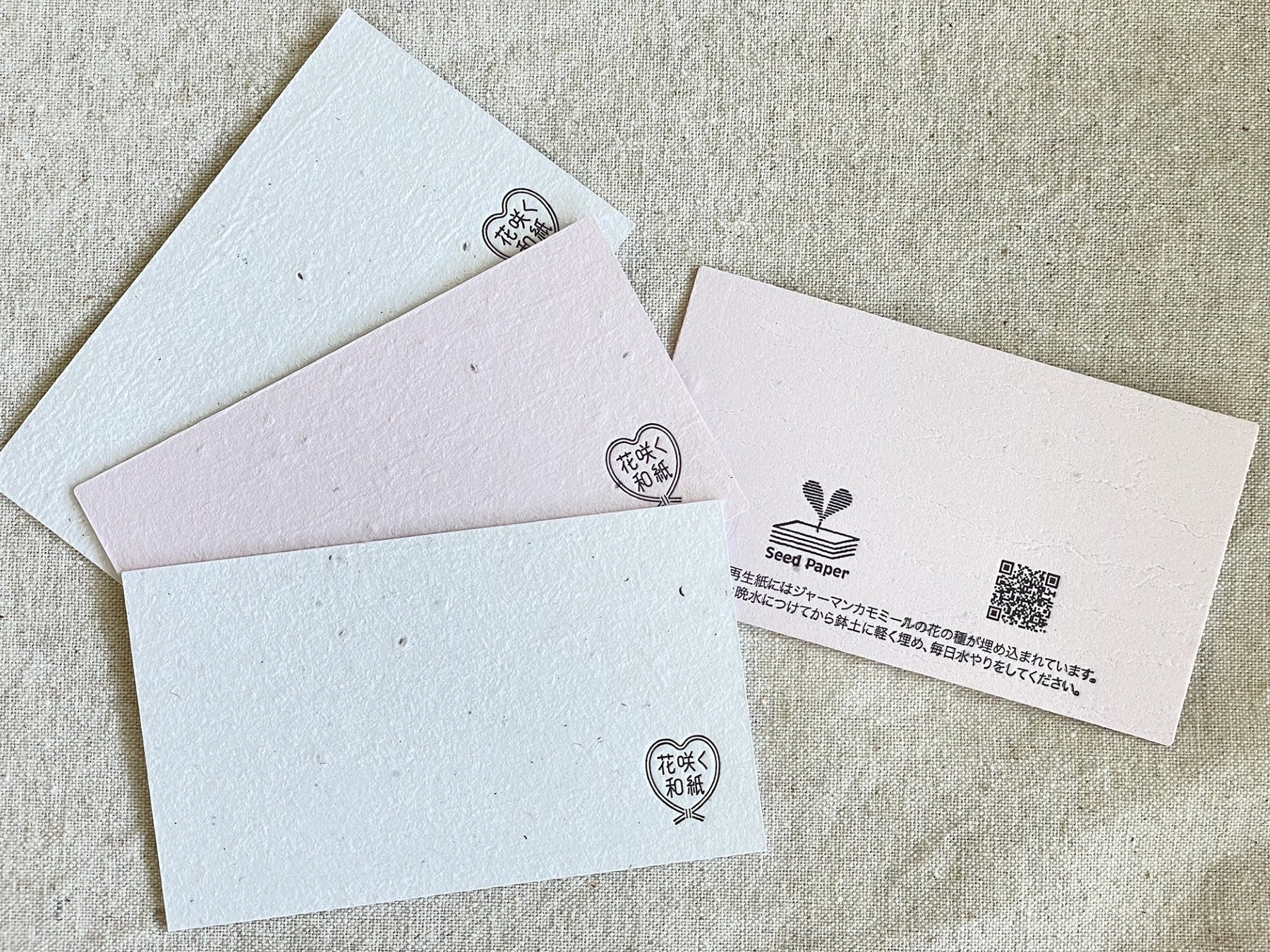 花を育て資源の循環をし未来へつなげる体験をご提案いたします。メニューカードをお持ち帰りいただき、ひと晩水につけてから植木鉢など植える場所に合わせ、お好きなサイズにちぎり土へ植えると、花の種が漉き込まれた古紙から数日で発芽し、やがて花が咲き紙は土へと還ります。