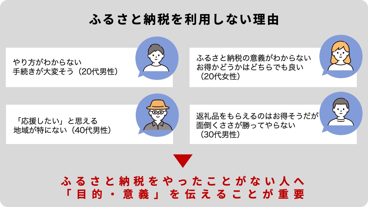 一方で、住民税の所得割の納税義務者数が約5978万人(※1)に対し、2022年のふるさと納税利用者数は約891万人(※2)という総務省の調査結果があります。つまり、ふるさと納税の利用率は14.9%で7人に1人しか利用していない計算となります。ボーダレスによるアンケート調査でも、ふるさと納税を利用しない理由として「手続きがよくわからない・面倒くさい」に加え、「ふるさと納税の意義がわからない」「応援したいと思える地域が特にない」という回答が得られました。