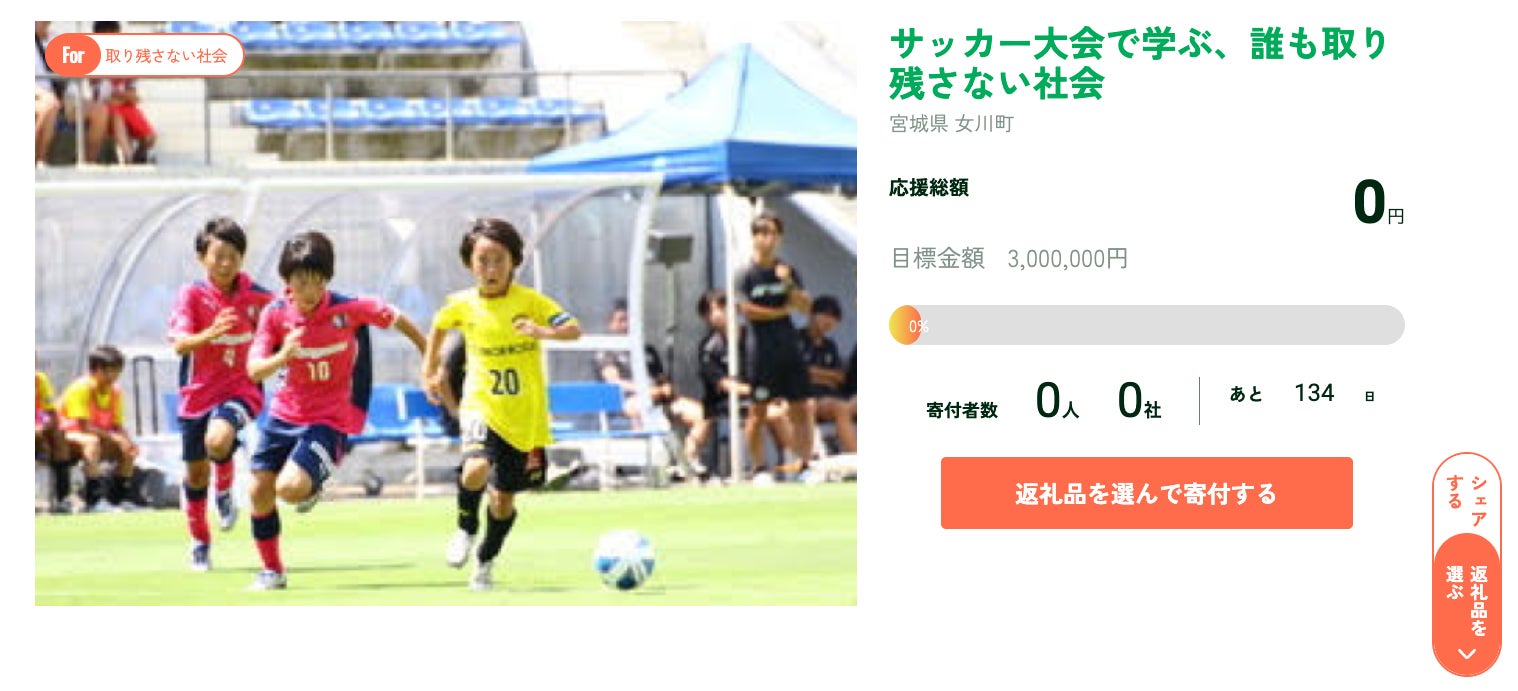 大会や合宿などを誘致することで、震災で減少した運動施設の利用者を増加させ、地域経済を活性化させる「スポーツによるまちづくり」をしている宮城県女川町のプロジェクトです。取り組みの一つとしてサッカーの全国大会「プレミアリーグU11チャンピオンシップ」を開催しています。この大会の特長は、1試合に必ず全員が出場する特別ルールが存在することと参加者全員に震災学習のプログラムが用意されていることです。震災の教訓を生かし、防災や命・仲間の大切さを次世代に伝えていくことは女川町の使命であると考えており、復興の歴史とサッカー大会を通じて、子供たちに全員で協力することの大切さや、辛いことがあっても立ち上がって挑戦する勇気を学んでもらいたいです。プロジェクトで集まった資金は子供たちの交通費などの大会運営費用として活用させていただきます。
