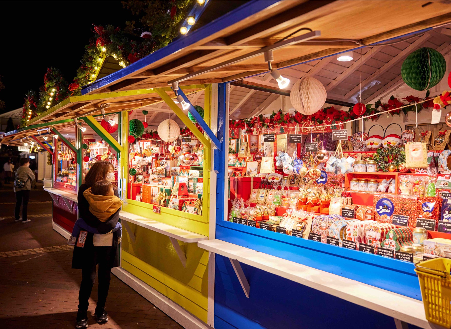 ヨーロッパさながらのクリスマスマーケットを散策しよう。グルメやホットドリンクを片手に、で身体をあたためながら満喫できます。