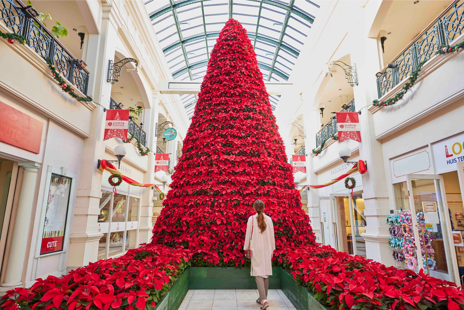 クリスマスシーズンは真っ赤なポインセチアのツリーが登場。鮮やかな美しさと迫力に圧倒されること間違いなし。