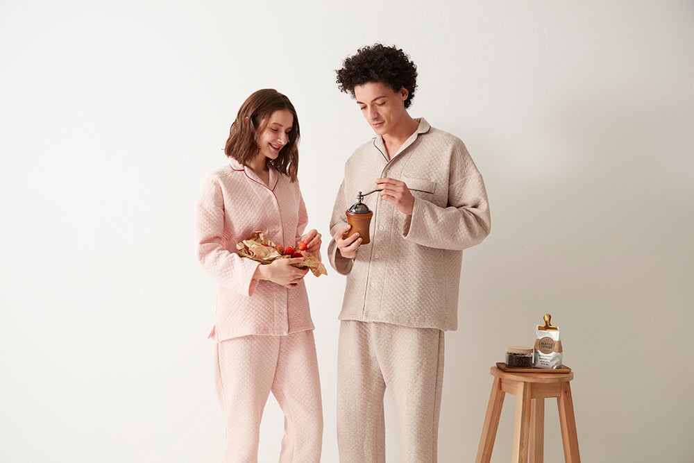 この度発売した新商品は、寝返りしやすい設計に加え、植物から抽出した色素と現代の色素のハイブリッドで染めたオーガニックコットンの糸を使った綿100%の生地と、リサイクルポリエステルの中わたを使用したキルト素材を採用。やわらかい肌ざわりと膨らみ感で秋冬にぴったりのパジャマに仕上げています。婦人は、ストロベリーで染めたダークピンクとレモンで染めたレモンイエローの2色、紳士は、コーヒーで染めたライトブラウンと抹茶で染めたモスグリーンの2色をラインアップ。こころ休まるカラーリングにもこだわりました。人にも環境にもやさしいKAIMIN NAVIパジャマが、リラックスタイムを快適に、そしてやさしく彩ります。