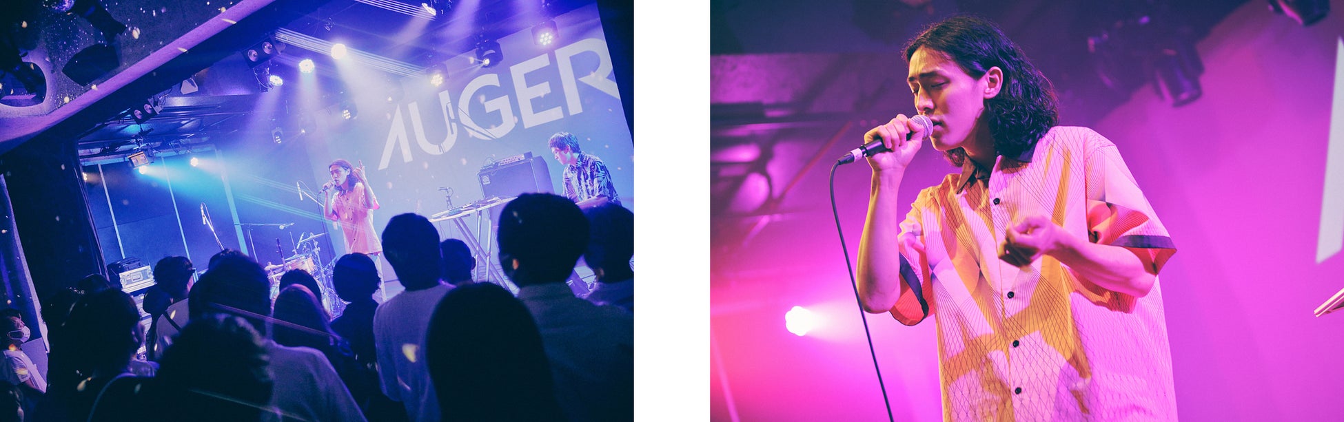 2組目に登場したのは、新東京。新東京は東京を中心に活動する4人組のロックバンドでメンバー全員が現役大学生です。様々なジャンルの楽曲を手掛け、幅広い世代から愛されており、色気のある歌声や高い演奏技術、そして上質で洗練された楽曲が特長です。1曲目は、「sanagi」を披露し、その後も立て続けに「Polaroid」、「The Few」、「utopian」、「Heavy Fog」、「Cynical City」、「36℃」の6曲を披露。特に、結成後初めてリリースした人気楽曲「Cynical City」を披露した際には、参加者は一気にパフォーマンスに引き込まれました。さらに、MCでは「今日は、様々なジャンルのアーティストやDJが登場するので、それぞれからAUGERらしさを感じ取ってもらいたいです。」と語ったうえで、「イベント前にAUGERのセットをもらって、メンバー全員、世界で一番薄い爪切りを使って早速爪を切ってきました。」とエピソードを披露し、会場の笑いを誘いました。