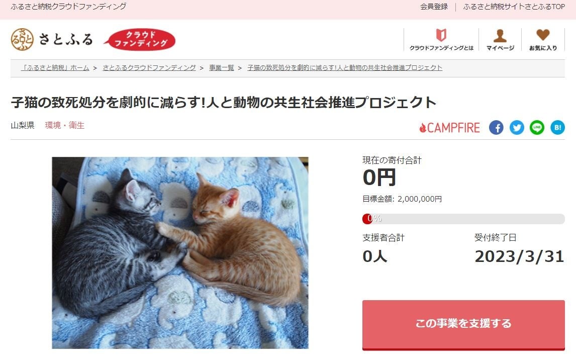 このプロジェクトでは、県民の動物愛護に対する意識の醸成を図り、飼い主への適正飼育の普及啓発を行うとともに、猫の不妊・去勢手術補助事業を拡充し、不妊・去勢手術を一層推進することで猫の無秩序な繁殖を防止し、猫の致死処分数の減少をめざします。また、ミルクボランティア活動を支援し子猫の譲渡促進にも引き続き取り組みます。人と動物の共生する社会の実現に向けた山梨県の取り組みに、皆さまのご支援をお願いいたします。