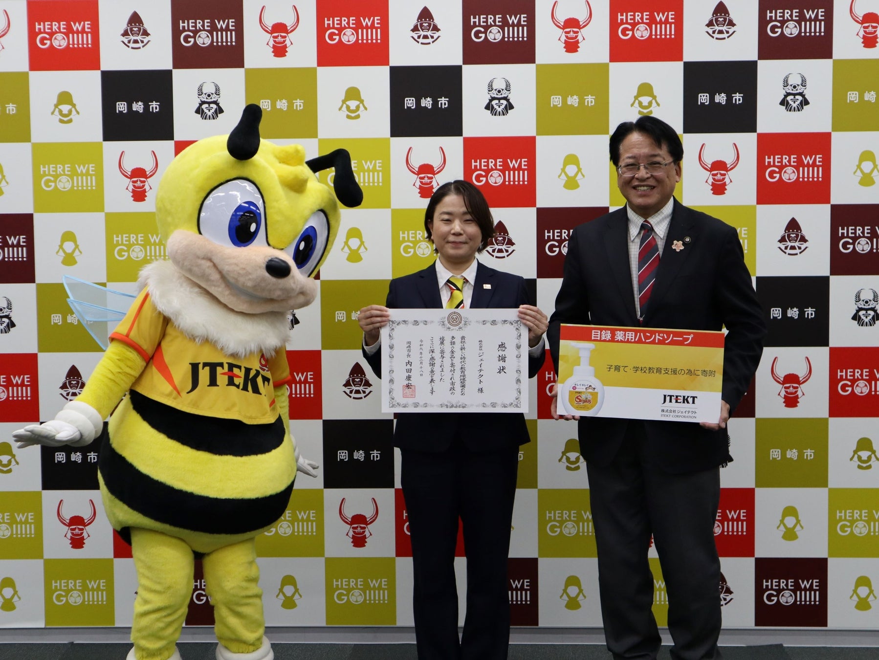株式会社ジェイテクト(本社:愛知県刈谷市、取締役社長:近藤 禎人、以下「ジェイテクト」)は、ライオン株式会社様にご協力いただき、男子バレーボールチーム「ジェイテクトSTINGS愛知」のオリジナルラベル仕様の薬用ハンドソープ 「キレイキレイ泡ハンドソープ」 を、愛知県各市町村の小中学校等に寄贈することを決定しました。そしてこの度12月18日(水)にチームのホームタウンである岡崎市で贈呈式を実施しました。