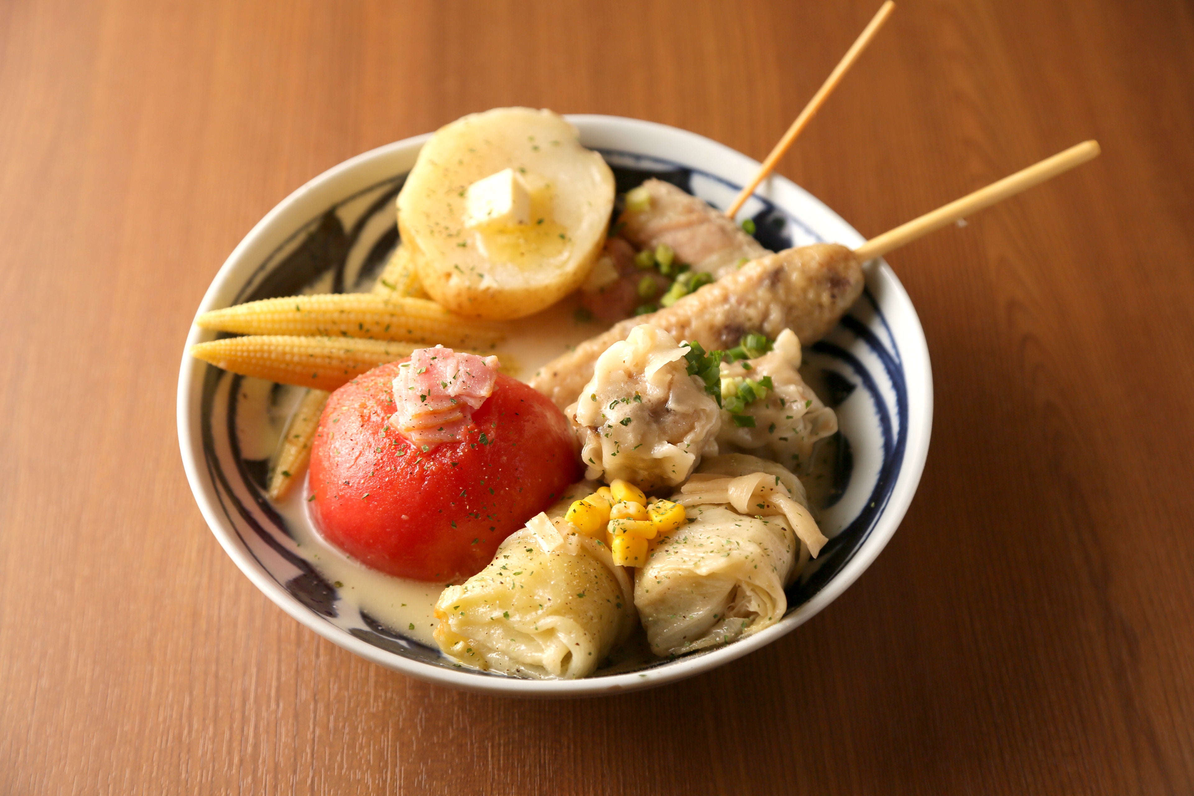 鶏の旨味が凝縮した白濁の濃厚 “鶏だしおでん” は、鶏もも肉を贅沢に1枚使用し、じっくり煮込んだホロホロ食感が特徴の 名物 「骨付き鶏」 がおすすめ!お好みでさわやかな辛みの柚子胡椒を付けてお召し上がりください。おでんの食材として初めて食べた!と女性に人気のトマトやじゃがバターなどもぜひご賞味ください。