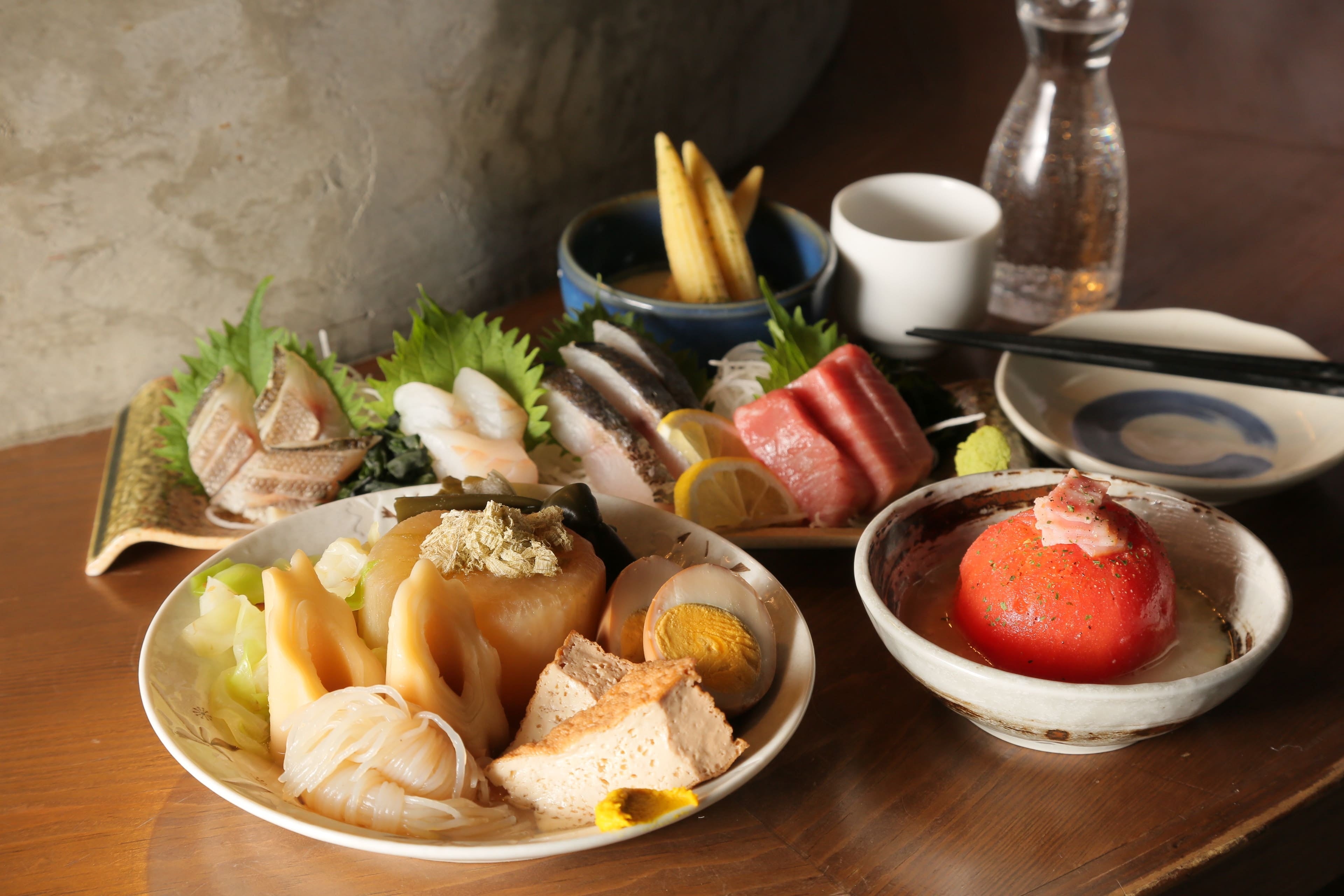 季節ごとに旬の野菜・食材を活かした自慢の “創作おでん” として味わえる他、毎日仕入れる “新鮮な魚の刺身” も大人気で、刺身やおでんと相性の良い日本酒(名物出汁割りなど)を中心に、日本酒以外の飲み物も豊富に取り揃えております。「今までにないおでん屋のイメージ」 との声が多く、老若男女に好評をいただいており、 “気軽に通えるおでん屋・居酒屋” として、一人でも、カップルでも、友人・同僚と、様々なシーンでご利用・お楽しみいただけます。