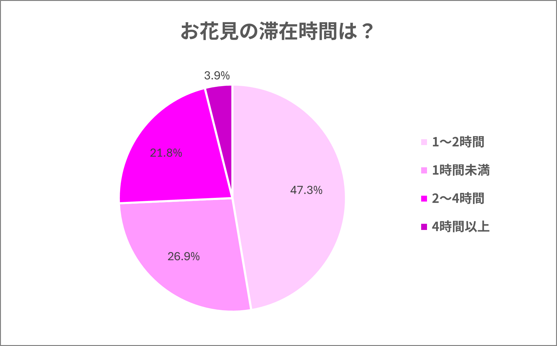 最多は「1〜2時間」(47.3%)で、約半数がこの時間帯でお花見を楽しんでいます。「2〜4時間」(21.8%)と「4時間以上」(3.9%)を合わせると約4人に1人が2時間以上滞在しており、長時間の外出となるケースも少なくありません。滞在時間が長くなるほど、スマートフォンのバッテリー消費も増加し、充電確保の重要性が高まります。