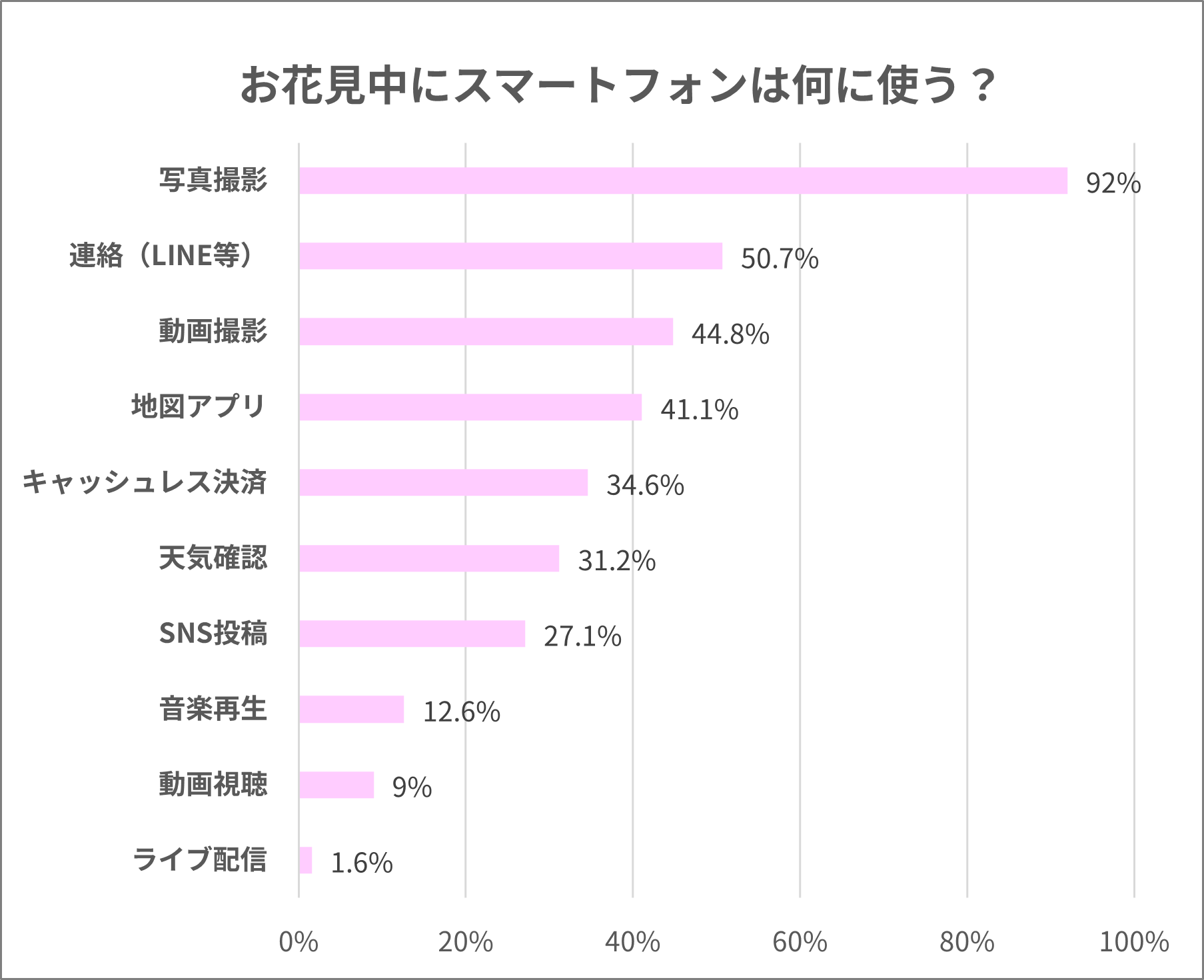 ▶ お花見中のスマホ用途1位は「写真撮影」92%、2位「連絡(LINE等)」50.7%と、スマホはお花見の必需品。