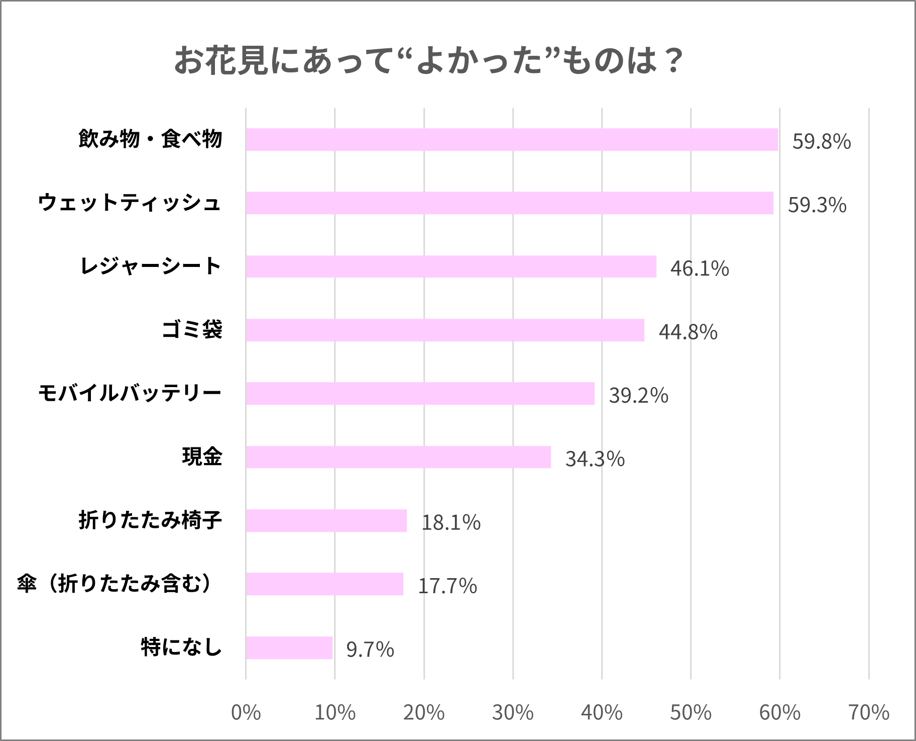 持っていってよかったものの1位は「飲み物・食べ物」(59.8%)、2位は「ウェットティッシュ」(59.3%)。注目されるのは5位の「モバイルバッテリー(レンタル含む)」(39.2%)で、実に4割近くのユーザーがお花見でのモバイルバッテリーの有用性を実感しています。