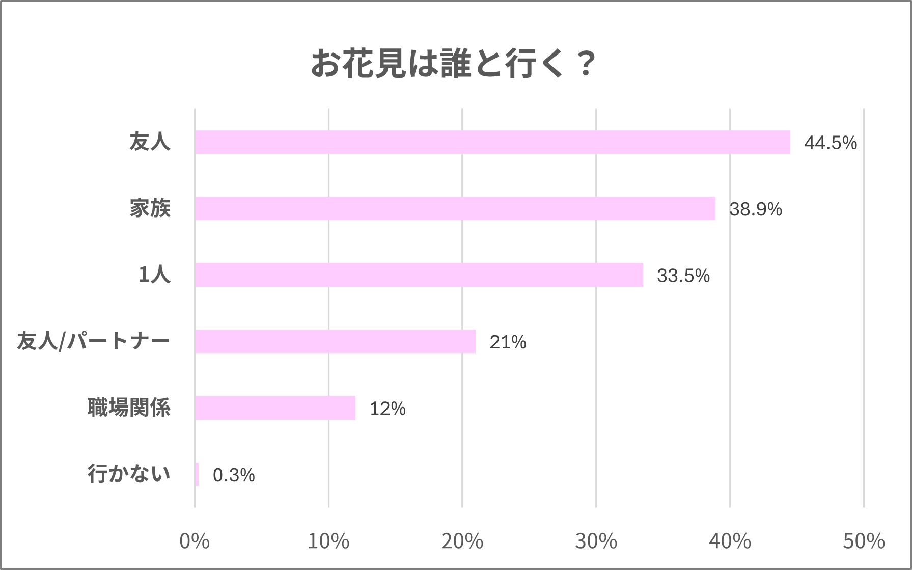 ▶ お花見の同行者は「友人」44.5%が最多。「家族」38.9%、「一人」33.5%と続く。(複数回答可)