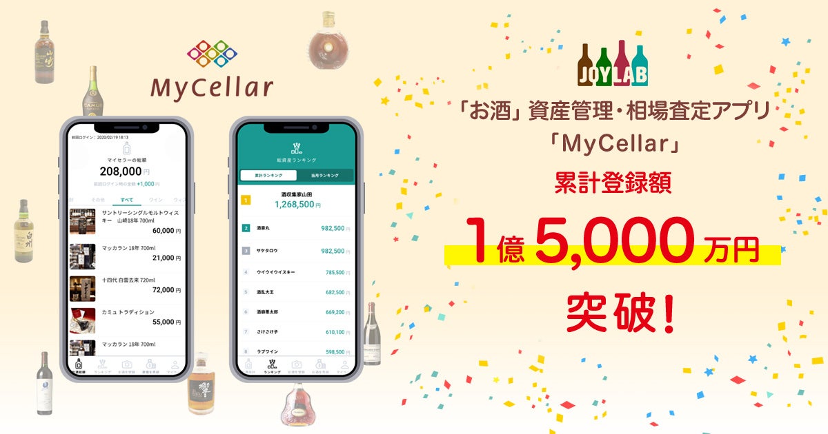 JOYLABの「お酒」の資産管理・査定相場情報アプリ「MyCellar(マイセラー)」登録資産金額1.5億円を突破!
