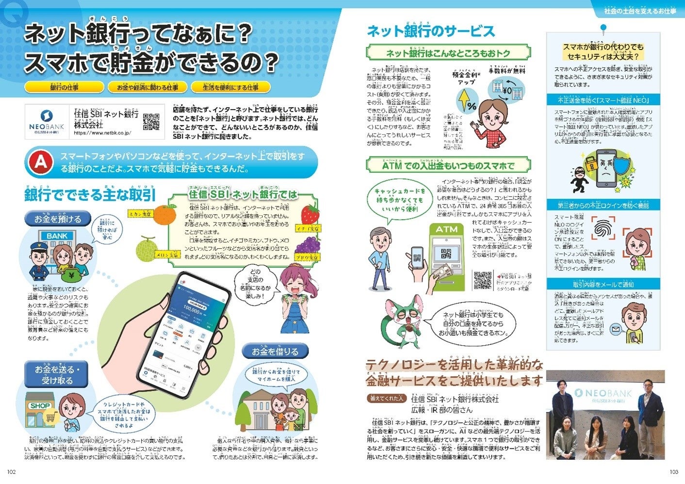 『おしごと年鑑2025』の住信SBIネット銀行の掲載ページでは、『ネット銀行ってなぁに?スマホで貯金ができるの?』をテーマに、スマホでできる主な銀行取引やネット銀行のサービス、セキュリティなどについて、わかりやすく紹介しています。