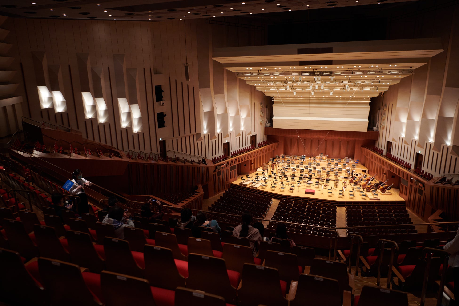 ツアーガイドの案内で、芸劇の建物や美術品のあるエリアを巡った後、オーケストラのセッティングがされている、コンサートホールの客席に入ります。誰もいない客席に入ることができるのは、劇場ツアーならでは。ホールの構造や音の響きについての解説を聞きながら、その美しい響きが生まれる空間を味わってみませんか?