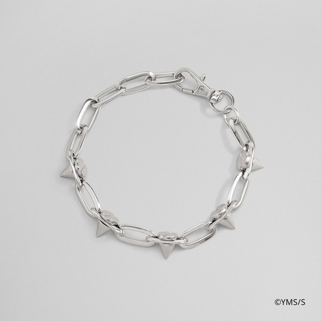 手首を一周する「スパイク」をあしらったチェーンブレスレット。クラスプは好みの長さで留めることができ、ユニセックスでの使用も可能です。