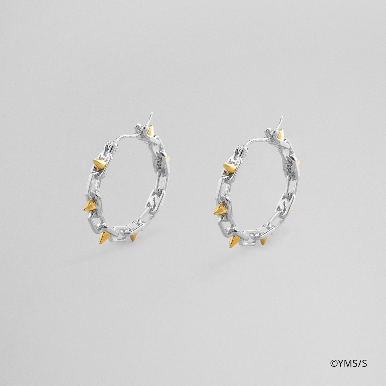 薔薇の棘を想起させる「スパイク」をあしらったチェーンを一周フープにした、ユニセックスなキャッチレスピアス。「スパイク」部分にはK18イエローゴールドコーティングを施し、程よい華やかさとチェーンの抜け感がハードすぎず、軽やかに着用できます。