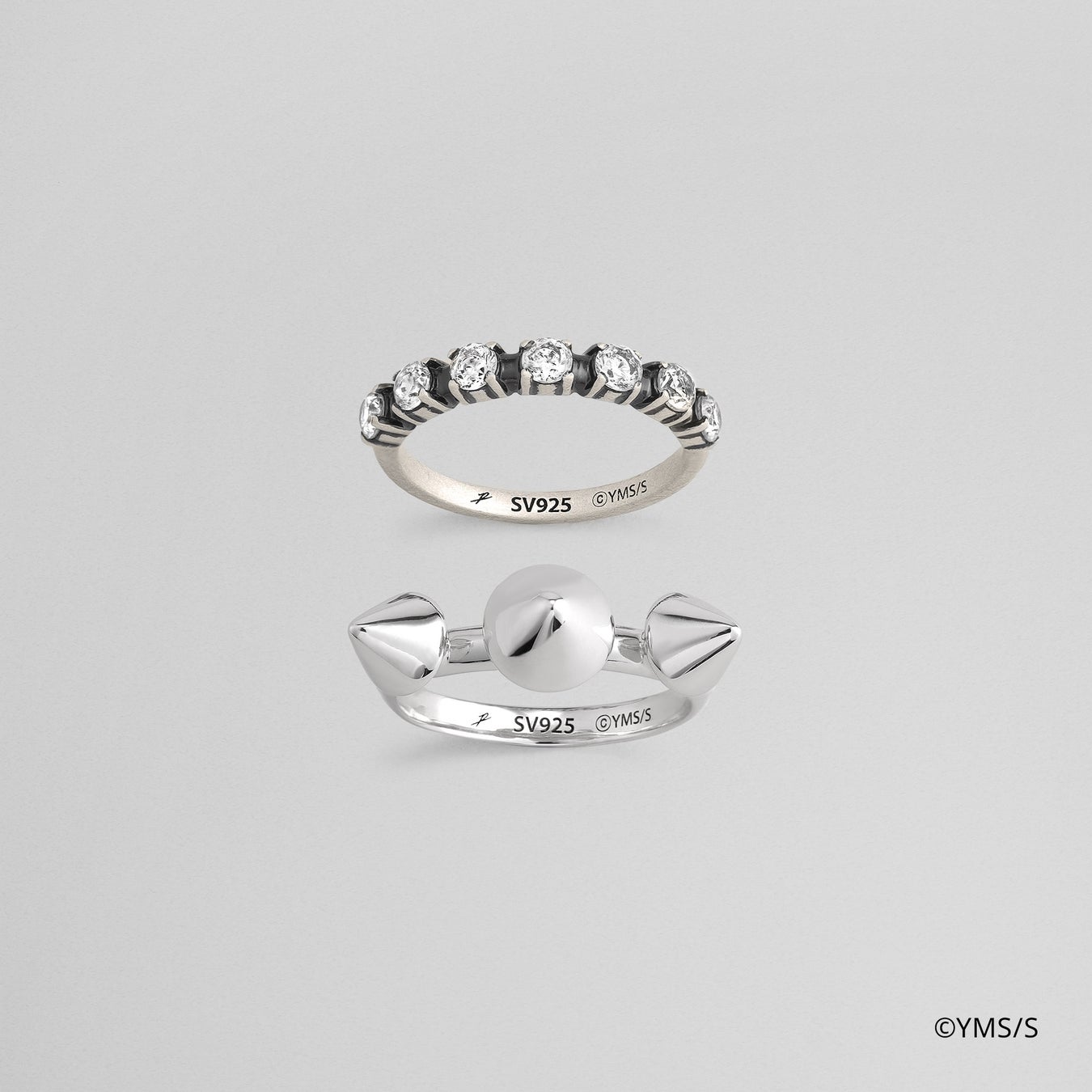 薔薇の棘を想起させる「スパイク」をあしらったリングと、キュービックジルコニアのラインストーンのリングの2点セット。単体ではもちろん、レイヤードして雰囲気を変えても楽しめます。