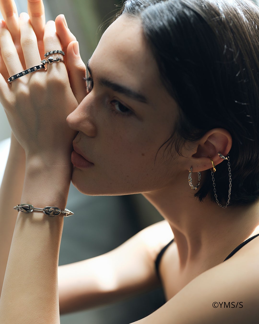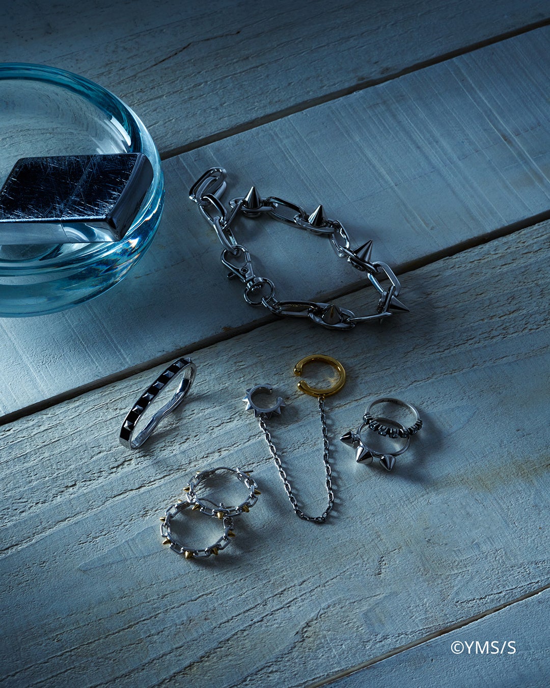 スタッズとブラックのレザーベルトをイメージした、パンキッシュなダブルフィンガーリング。ナナが”今”身に着けるとしたら、と想いを馳せてデザインされた手元の主役アイテムです。