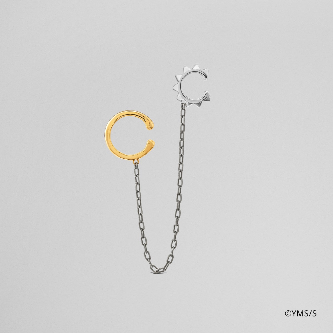 スタッズやチェーンを用いたロックテイストのイヤーカフ。1つでレイヤードが完成し、ピアスホール不要でパンキッシュなスタイリングを楽しめるデザインに仕上げました。