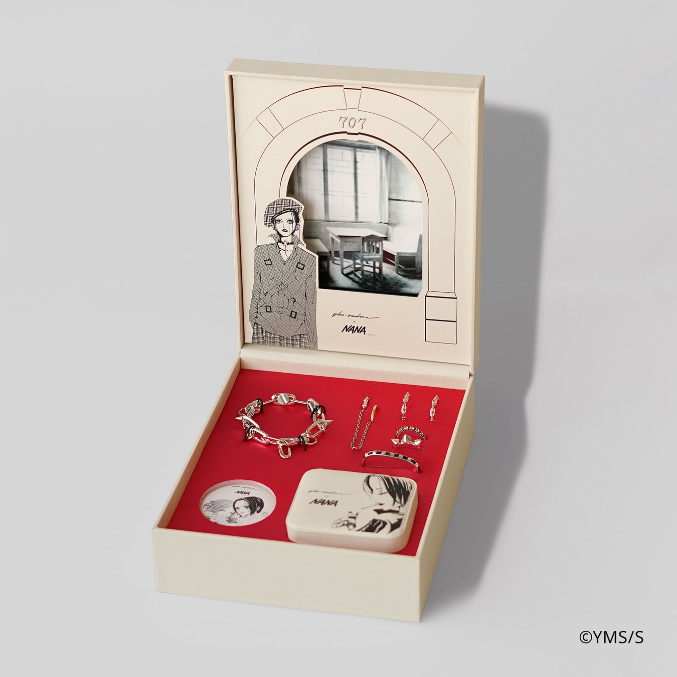「大崎ナナ(NANA)」をイメージした2種類のリング、イヤーカフ、ピアス、ブレスレットの5つのアイテムが全てセットになったコンプリートボックス。このセットのために特別に作られたボックスは、NANAの世界観を存分に楽しむことができます。