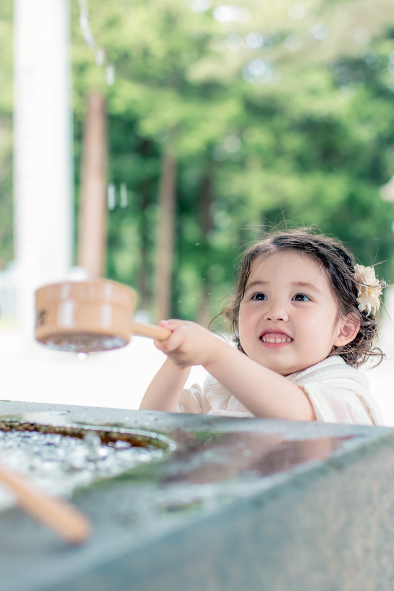 手水舎の周りに涼しい風が吹いおり、手を洗い涼しげに遊びながら撮影できるスポットです。