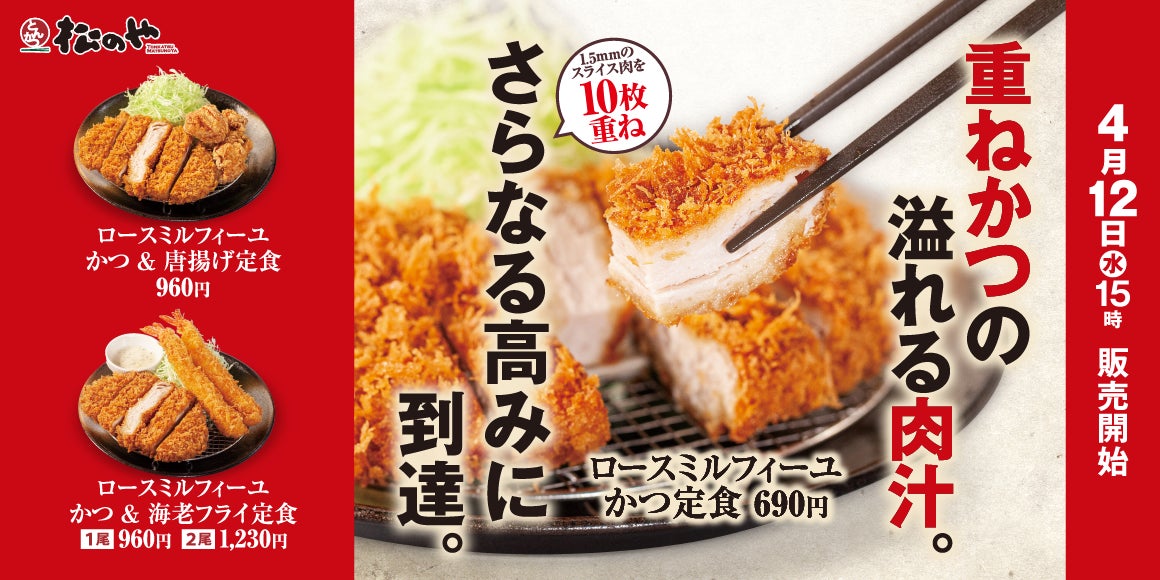 株式会社松屋フーズ(本社:東京都武蔵野市、代表取締役社長:瓦葺 一利)では、とんかつ専門店の「松のや・松乃家」におきまして、2023年4月12日(水)午後3時より、「ロースミルフィーユかつ」を発売いたします。