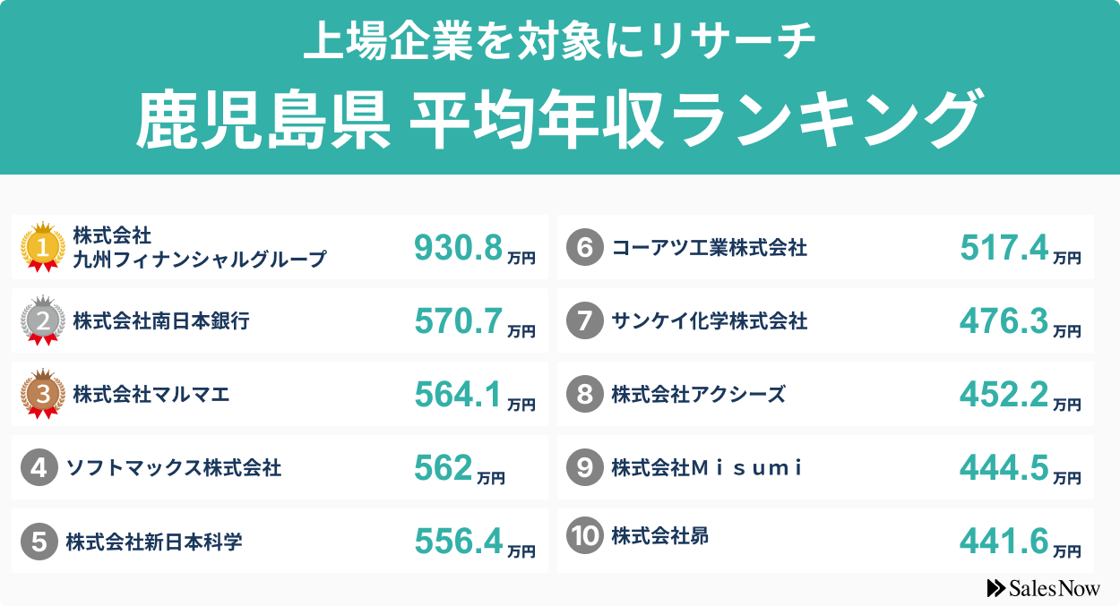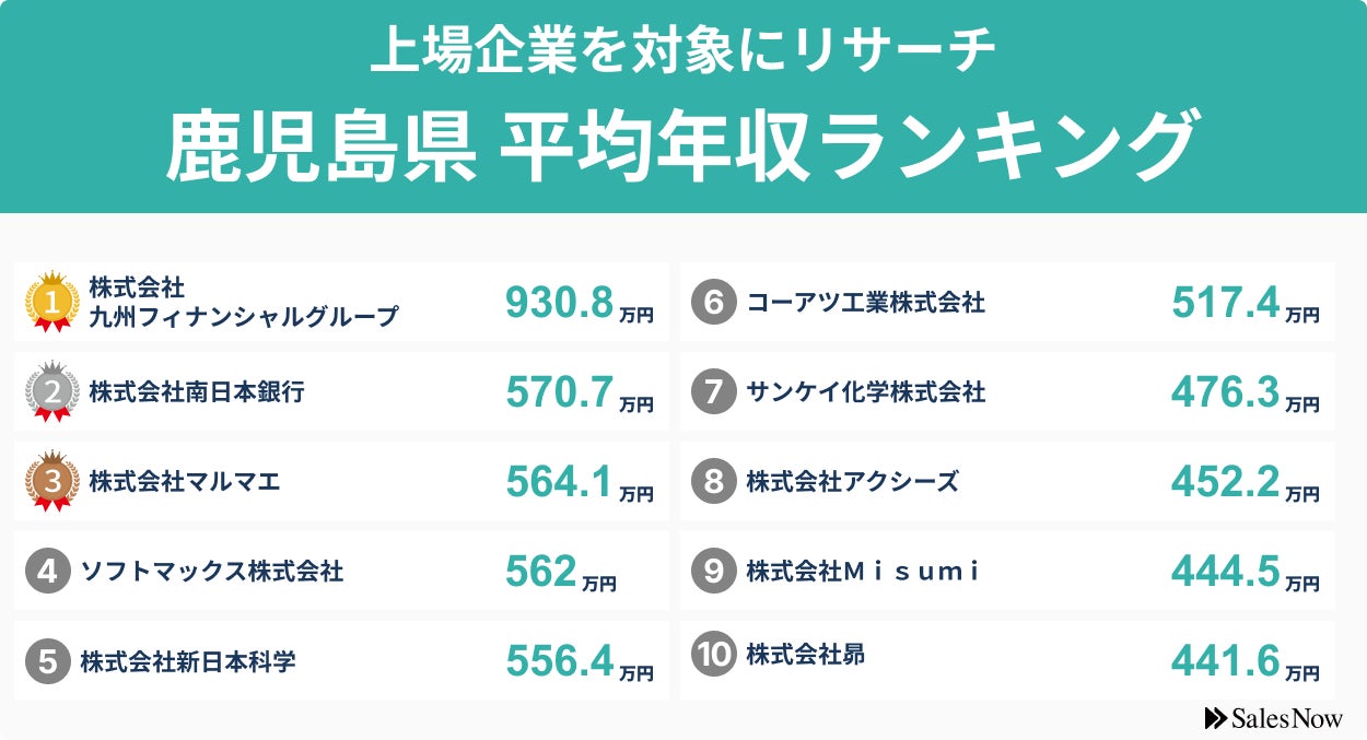 【鹿児島県】上場企業平均年収ランキングTOP10!/SalesNow DBレポート
