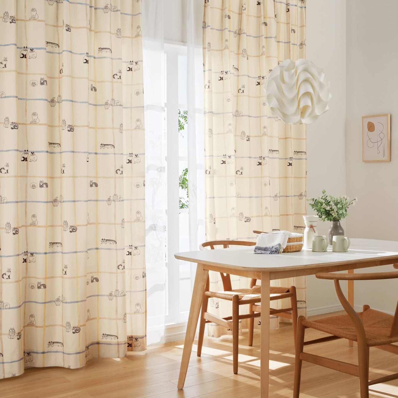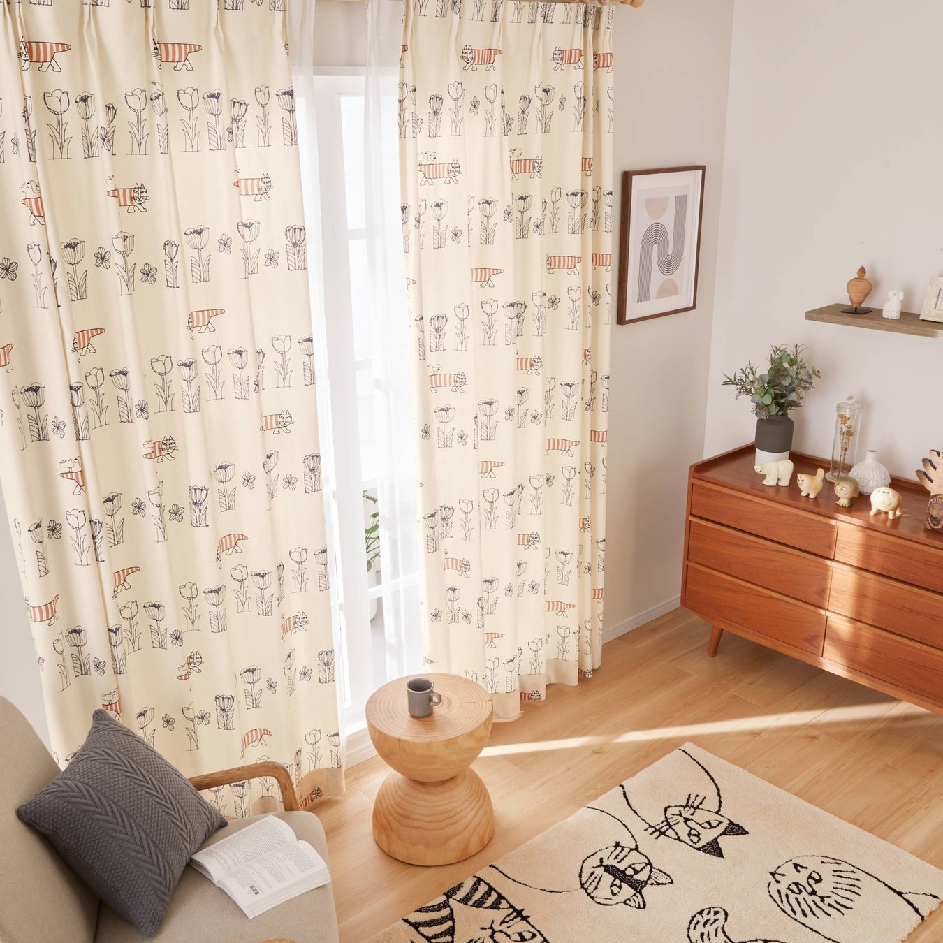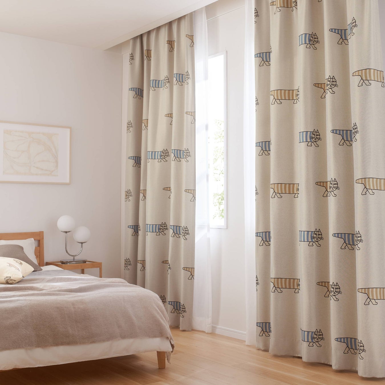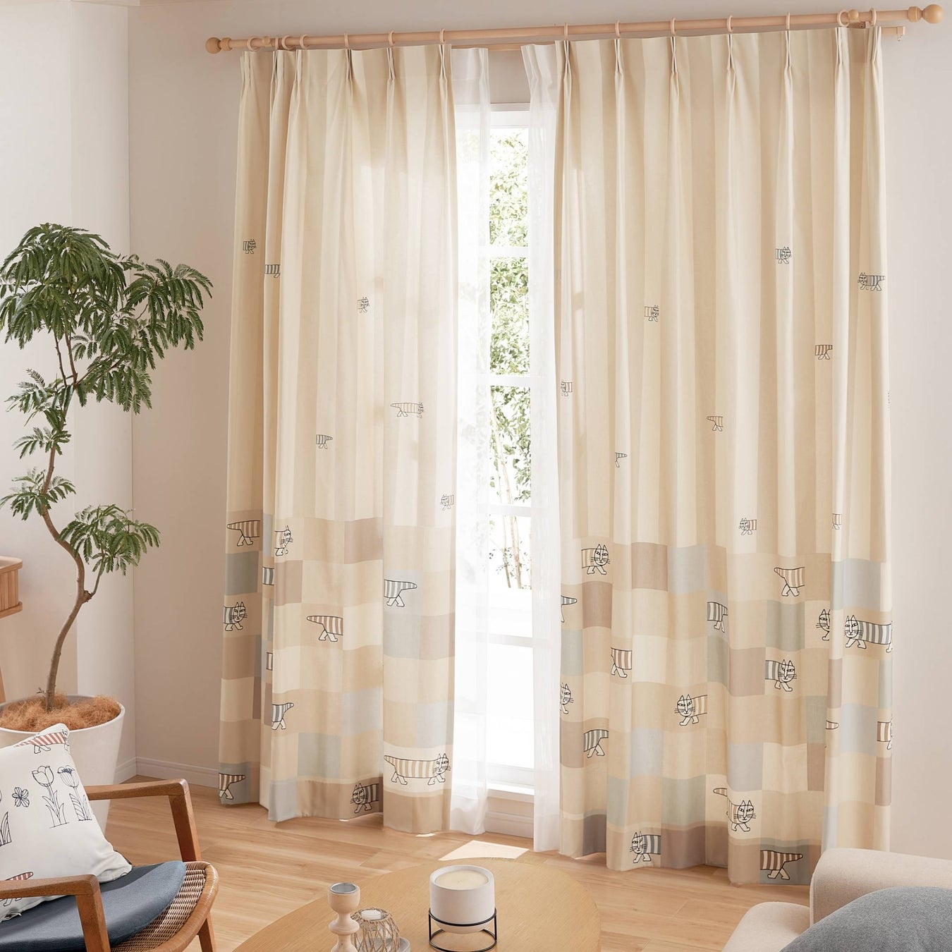 カーテンに描かれるマイキーやスケッチねこたちなどが日常にやさしさと楽しさを届けてくれます。