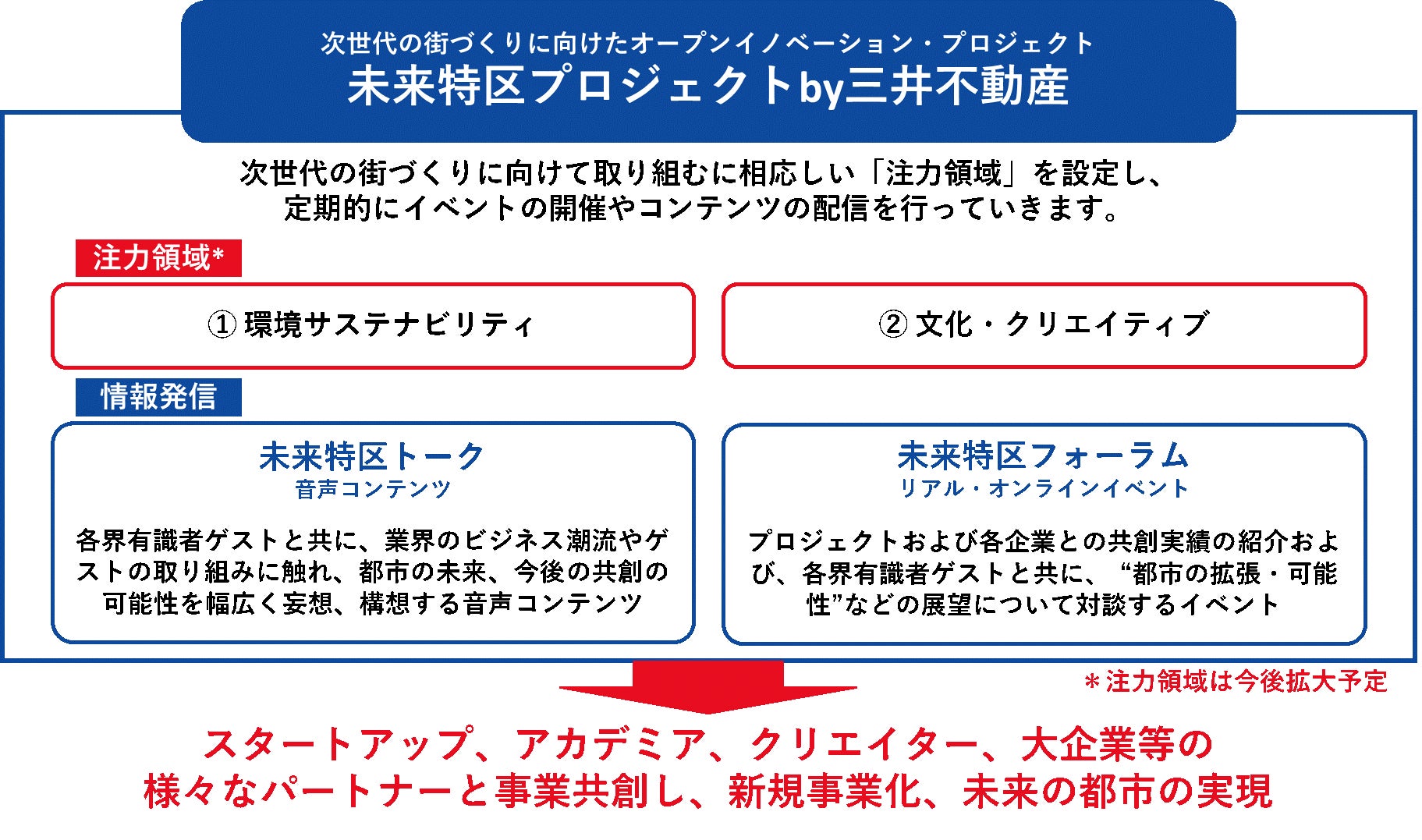 「未来特区プロジェクト」は、当社が次世代の街づくりに向けた「注力領域」を設定し、その領域における事業の共創をスタートアップ、アカデミア、クリエイター、大企業等の多様なプレイヤーに呼び掛け、推進するオープンイノベーション・プロジェクトです。「未来特区プロジェクト by MitsuiFudosan Co.,Ltd.」で出会ったパートナーとの事業共創をさらに発展させた継続的なプログラムとして再始動します。再始動にあたっては「環境サステナビリティ」、「文化・クリエイティブ」の2つを「注力領域」と位置づけます。本日5月29日よりポッドキャストにて音声コンテンツ「未来特区トーク」を配信開始、6月20日には「未来特区フォーラム」を事業開始のキックオフイベントとして開催し、定期的にコンテンツ配信やイベント開催等を行います。今後は、各「注力領域」において共創パートナーを探索し、新規事業化を目指します。