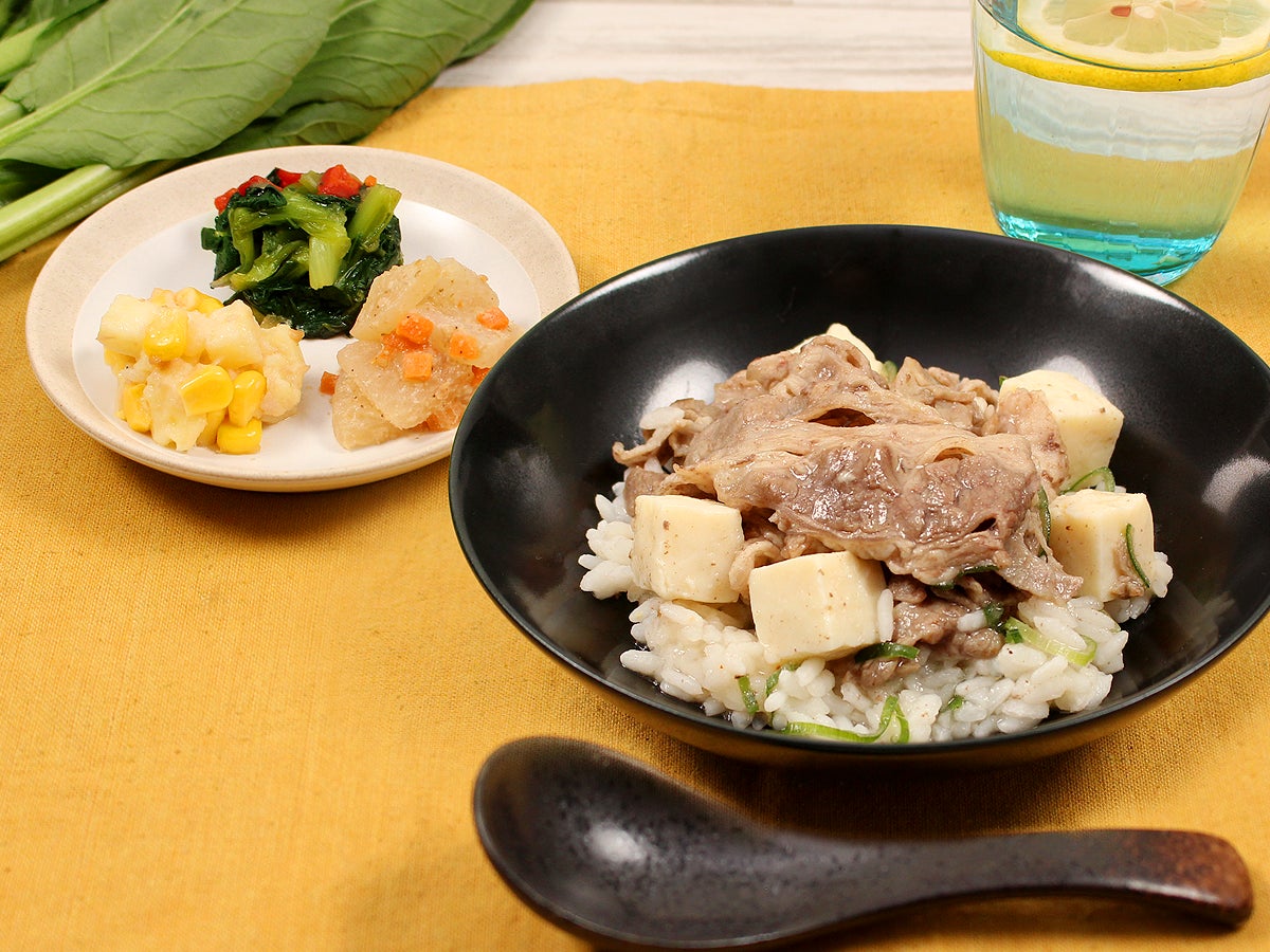 大阪グルメの一つである「肉吸い」の美味しさをそのままに、ごはんメニューにアレンジしました。商品企画担当者一押し、ナッシュのオリジナルメニューの完成です!優しい鰹出汁の効いたソースが牛肉とお米を包み込み、これまでにない一体感を演出しています。食べると、ほっこりすること間違いなし?!な逸品です。豆腐はご飯やお肉と一緒にいただくだけではなく、少しくずしていただくのもおすすめです!