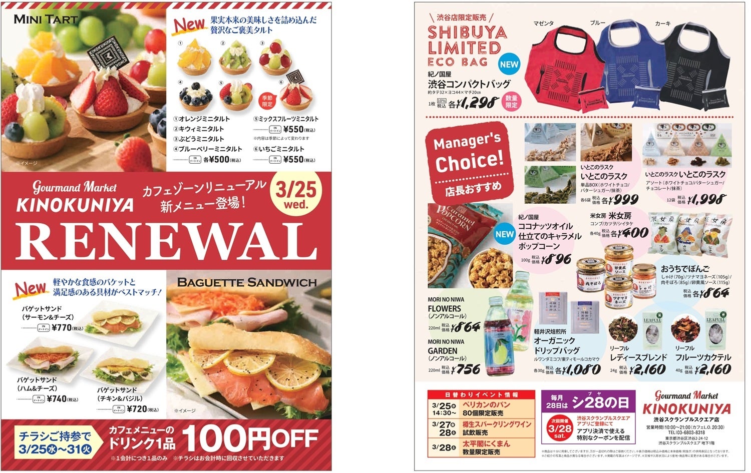 株式会社紀ノ國屋(本社:東京都新宿区)は、2026年3月25日(水)、Gourmand Market KINOKUNIYA 渋谷スクランブルスクエア店のカフェゾーンをリニューアルオープンいたします。果実の美味しさをそのまま閉じ込めた「フルーツミニタルト」や、軽やかな食感のバゲットに具材をたっぷり挟んだ「バゲットサンド」など、新たなカフェメニューが登場します。また、開業時の限定バッグをベースにした渋谷店限定デザインのコンパクトバッグも数量限定で発売。リニューアルを記念した特別企画も実施いたします。