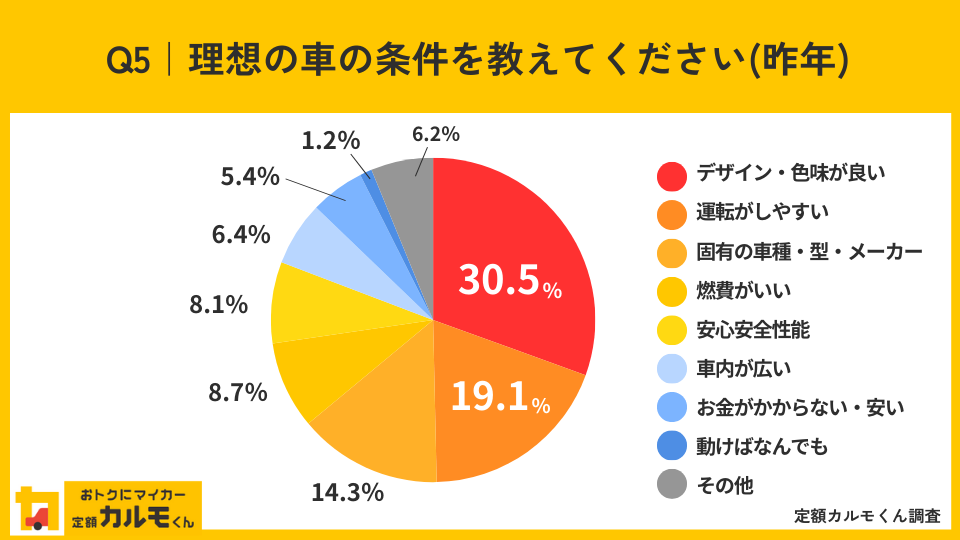 続いて、Q2で自家用車を「持っている」と回答した方に、理想の車の条件を聞いたところ、最も多かったのは「デザイン・色味が良い」が23.0%でした。具体的には「オシャレでスタイリッシュな車」「外見がかっこいい車」などが挙げられました。次いで多かったのは、「運転がしやすい」で20.6%でした。「快適に乗れる車」のほか、コンパクトカーでは「小回りの利く車」を求めている方が多くみられました。昨年と比較すると「お金がかからない・安い」の割合が6%増加し、車を購入する際に価格を重視する方が増えている傾向がみられます。