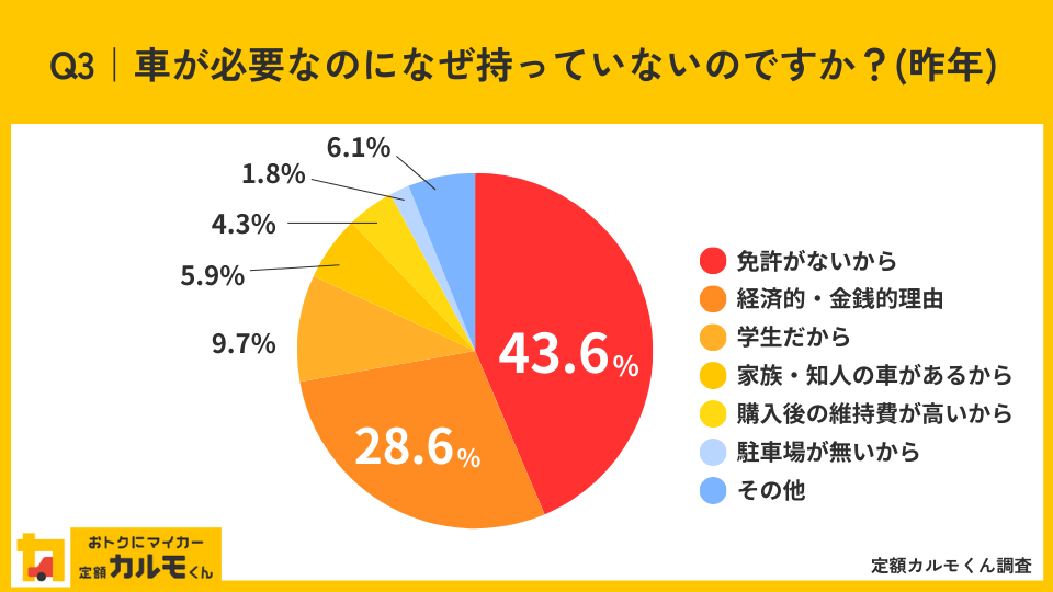 続いて、Q2で「持っていない」と回答した方に理由を聞いたところ、最も多かったのは「免許がないから」で45.9%、次いで多かったのは「経済的・金銭的理由」で27.0%でした。昨年と比較すると、主な理由は同じであるものの、「免許がないから」と答えた方の割合が増える結果となりました。