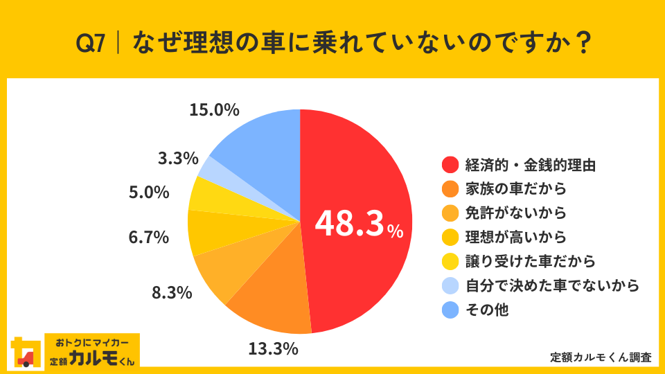 Q6で「乗れていない」と回答した方に理由を聞いたところ、最も多かったのは「経済的・金銭的理由」で48.3%、約半数を占める結果となりました。次いで多かったのは「家族の車だから」で13.3%でした。昨年と比較すると、「家族の車だから」の割合が8.5%増え、車を家族と共有して使用している方が多いことがわかりました。