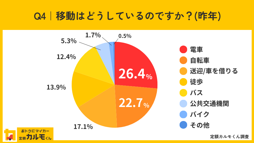 さらにQ2で「持っていない」と回答した方に、移動はどうしているのか聞いたところ、最も多かったのは「電車」で28.9%でした。次いで多かったのは「自転車」で20.6%でした。昨年と比べ、「電車」を利用している方の割合が2.5%増えたほか、「徒歩」を選んでいる方が5%増えていることがわかりました。