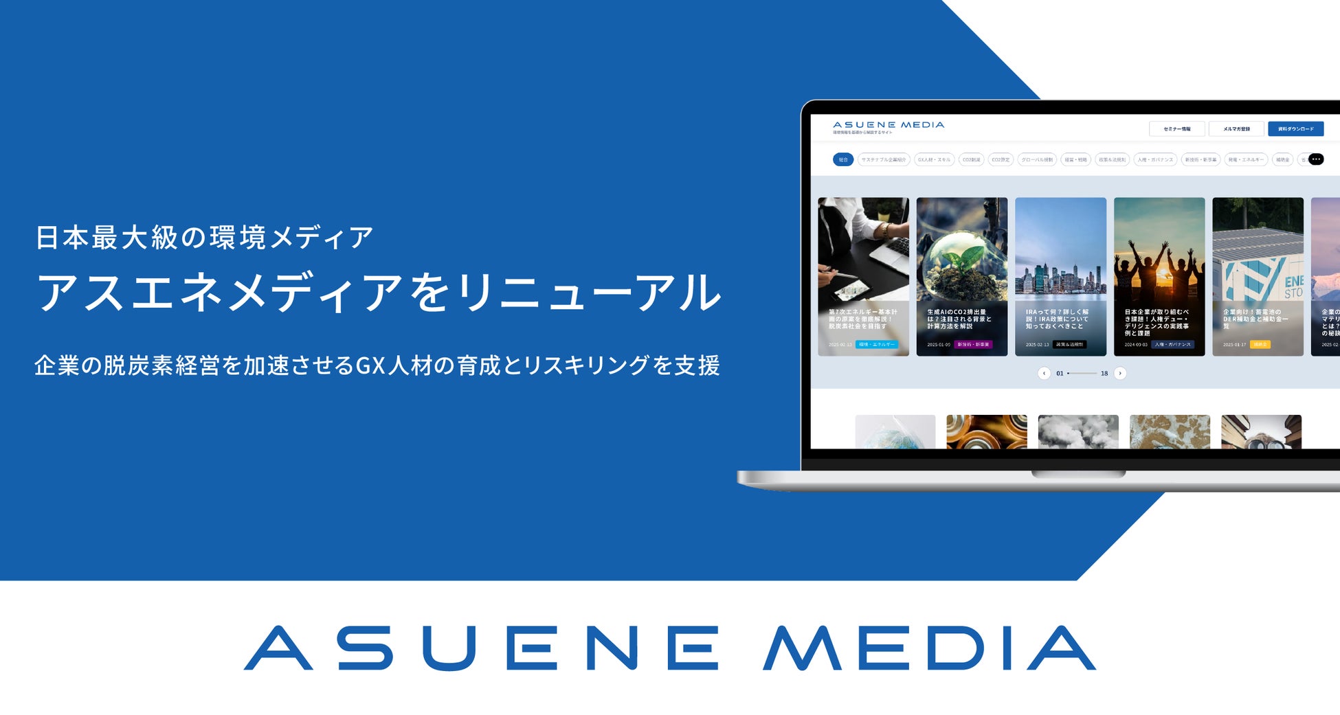 アスエネ株式会社(本社:東京都港区、代表取締役CEO:西和田 浩平、以下「当社」)は、日本最大級の環境情報を基礎から解説するサイト「アスエネメディア」をリニューアルしました。今回のリニューアルにより、カーボンニュートラルに積極的に取り組み、ESG経営を推進する企業担当者やGX分野での活躍を目指す人材に向けて、より有益かつ実践的な情報を提供します。