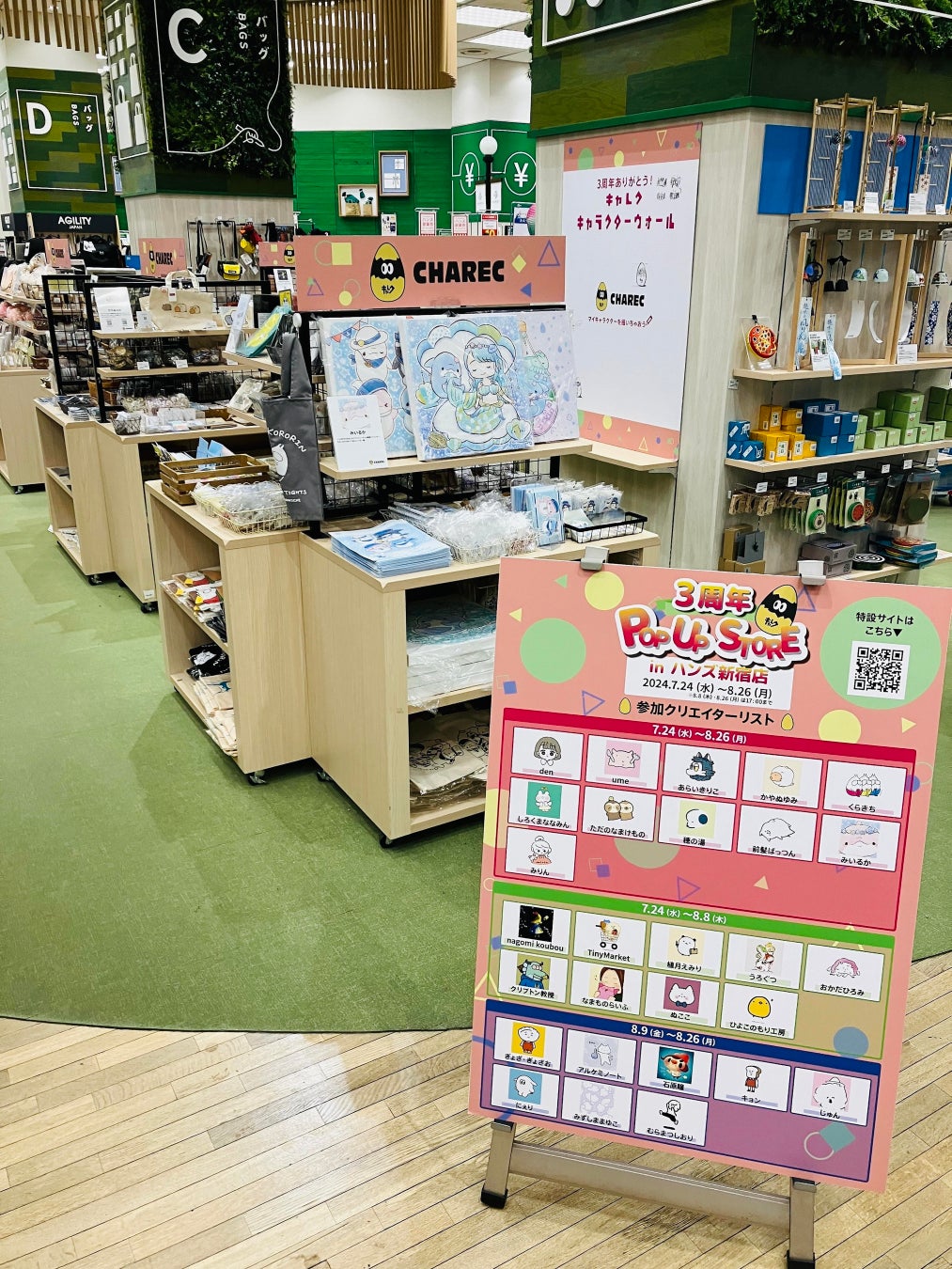 株式会社ハンズ(本社:東京都新宿区)は、2021年8月より開始した、キャラクターを生み出すクリエイターの活動発信プラットフォーム「CHAREC(キャレク)」が3周年を迎えたことをお知らせいたします。この間、店頭でキャラクターづくりワークショップや物販イベントを開催するなど、クリエイターとファンであるお客様とのコミュニケーションを育ててまいりました。この度、運営開始より3周年を記念して、ハンズ新宿店にて7月24日(水)から8月26日(月)までの34日間、総勢28名のキャラクリエイターが出展するイベントを開催しております。新作のオリジナルキャラクターグッズ販売や、リクエストイラスト会、キャラクターづくりワークショップなどバラエティ豊かな企画が盛りだくさんのイベントです。