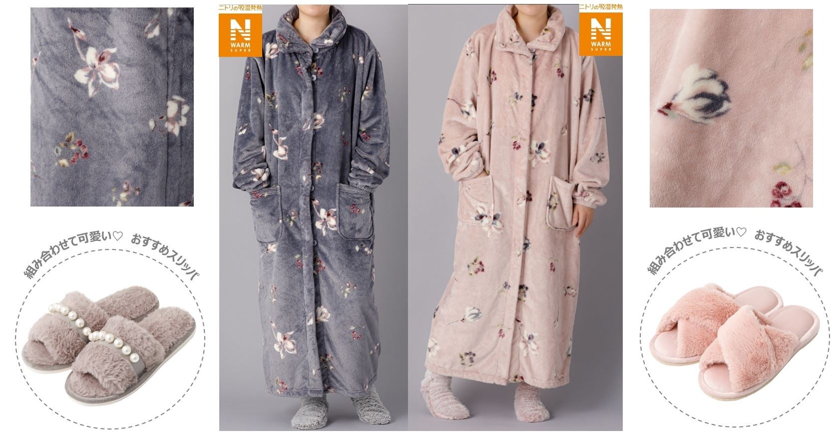 ◆今年の花柄着る毛布は昨年よりもお花が大きく、ボリュームあるデザインです。大きなパールが付いたスリッパやボリュームあるファーのスリッパで大人シックなコーディネートを。