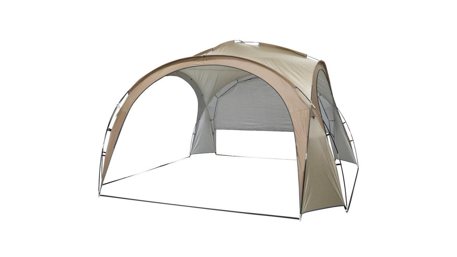 4×4mの大型シェード。大人数のデイキャンプでも中の空間が広々使えます。また、軽量でコンパクトに収納できるので持ち運びに便利です。