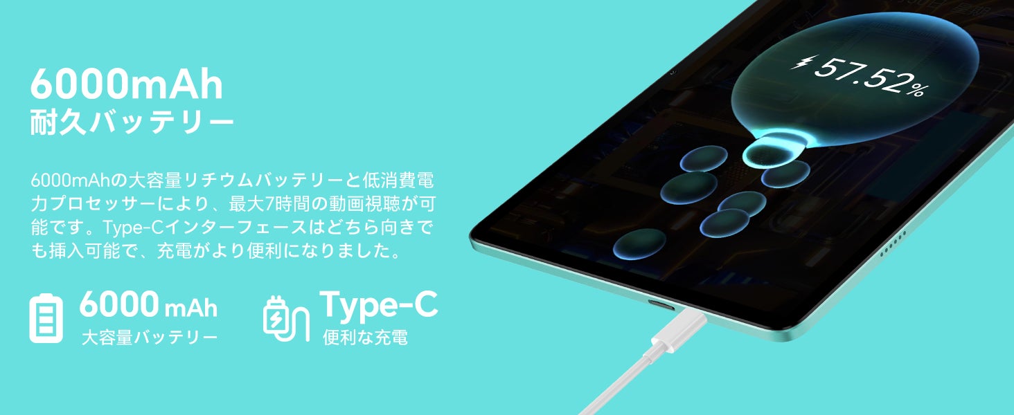 6000mAhの大容量リチウムバッテリーと低消費電力プロセッサーにより、最大7時間の動画視聴が可能です。Type-Cインターフェースはどちら向きでも挿入可能で、充電がより便利になりました。